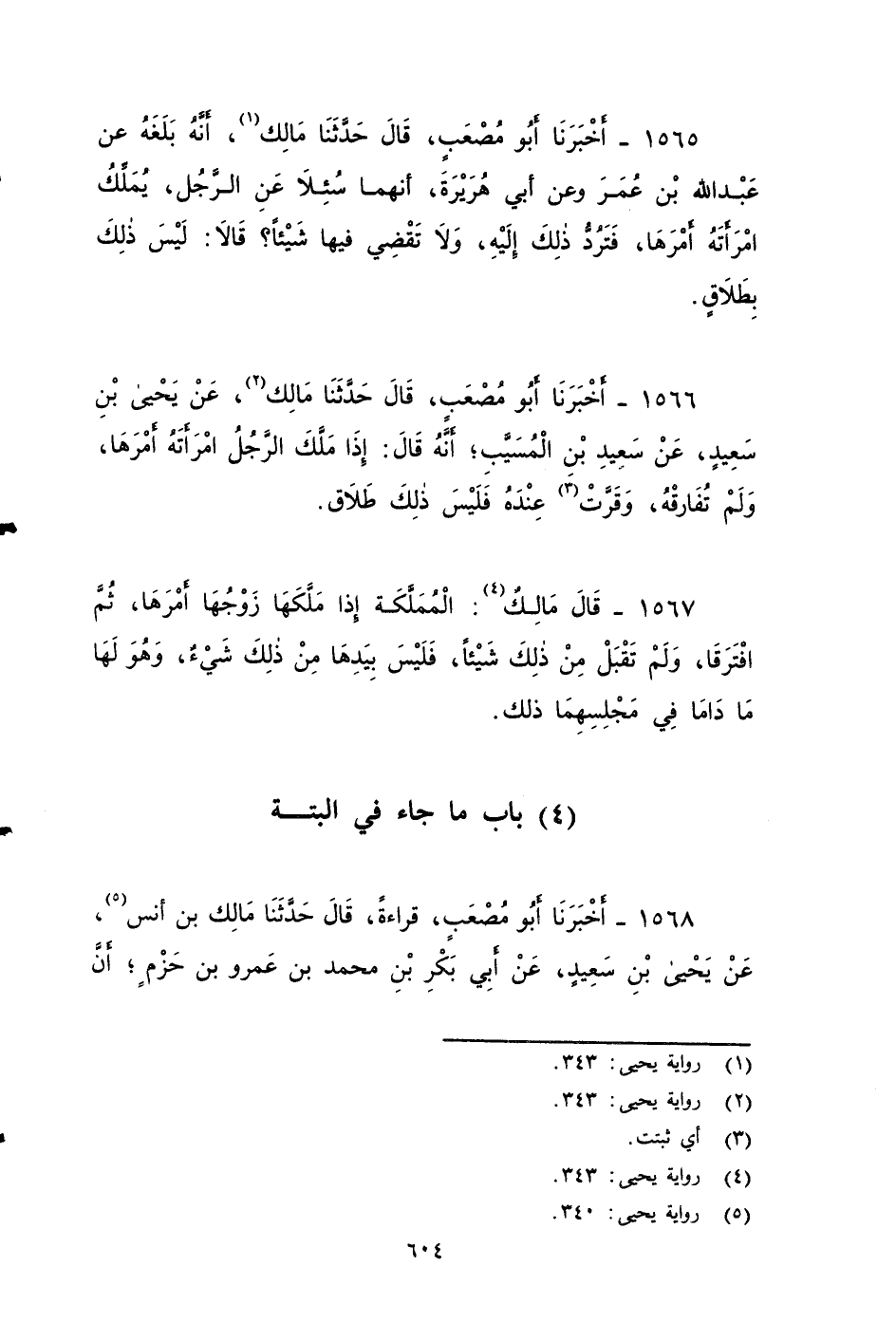 ١٥٦٨ - أَخْبَرَنَا أَبُو مُصْعَبٍ قراءة، قَالَ: حَدَّثَنَا مَالِكٌ بن أنس، عَنْ يَحْيَى بْنِ سَعِيدٍ، عَنْ أَبِي بَكْرِبن محمد بن عمرو بْنِ حَزْمٍ، أَنَّ عُمَرَ بْنَ عَبْدِ الْعَزِيزِ قَالَ: الْبَتَّةُ مَا يَقُولُ النَّاسُ فِيهَا؟ قَالَ أَبُو بَكْرٍ: فَقُلْتُ لَهُ: كَانَ أَبَانُ بْنُ عُثْمَانَ يَجْعَلُهَا وَاحِدَةً، فَقَالَ عُمَرُ بْنُ عَبْدِ الْعَزِيزِ: لَوْ كَانَ الطَّلَاقُ أَلْفًا مَا أَبْقَتِ الْبَتَّةُ مِنْهُ شَيْئًا، مَنْ قَالَ: الْبَتَّةَ , فَقَدْ رَمَى الْغَايَةَ الْقُصْوَى.