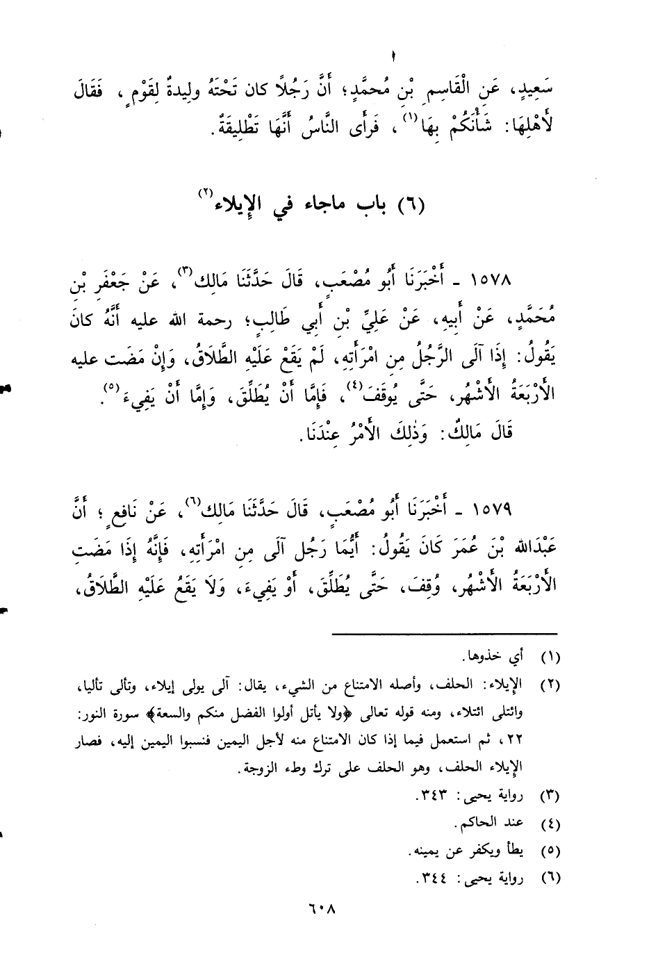 ١٥٧٨ - أَخْبَرَنَا أَبُو مُصْعَبٍ، قَالَ: حَدَّثَنَا مَالِكٌ، عَنْ جَعْفَرِ بْنِ مُحَمَّدٍ، عَنْ أَبِيهِ، عَنْ عَلِيِّ بْنِ أَبِي طَالِبٍ - رحمة الله عليه - , أَنَّهُ كَانَ يَقُولُ: إِذَا آلَى الرَّجُلُ مِنِ امْرَأَتِهِ، لَمْ يَقَعْ عَلَيْهِ الطَلَاقٌ، وَإِنْ مَضَتِ الأََرْبَعَةُ الأََشْهُرِ حَتَّى يُوقَفَ، فَإِمَّا أَنْ يُطَلِّقَ , وَإِمَّا أَنْ يَفِيءَ.