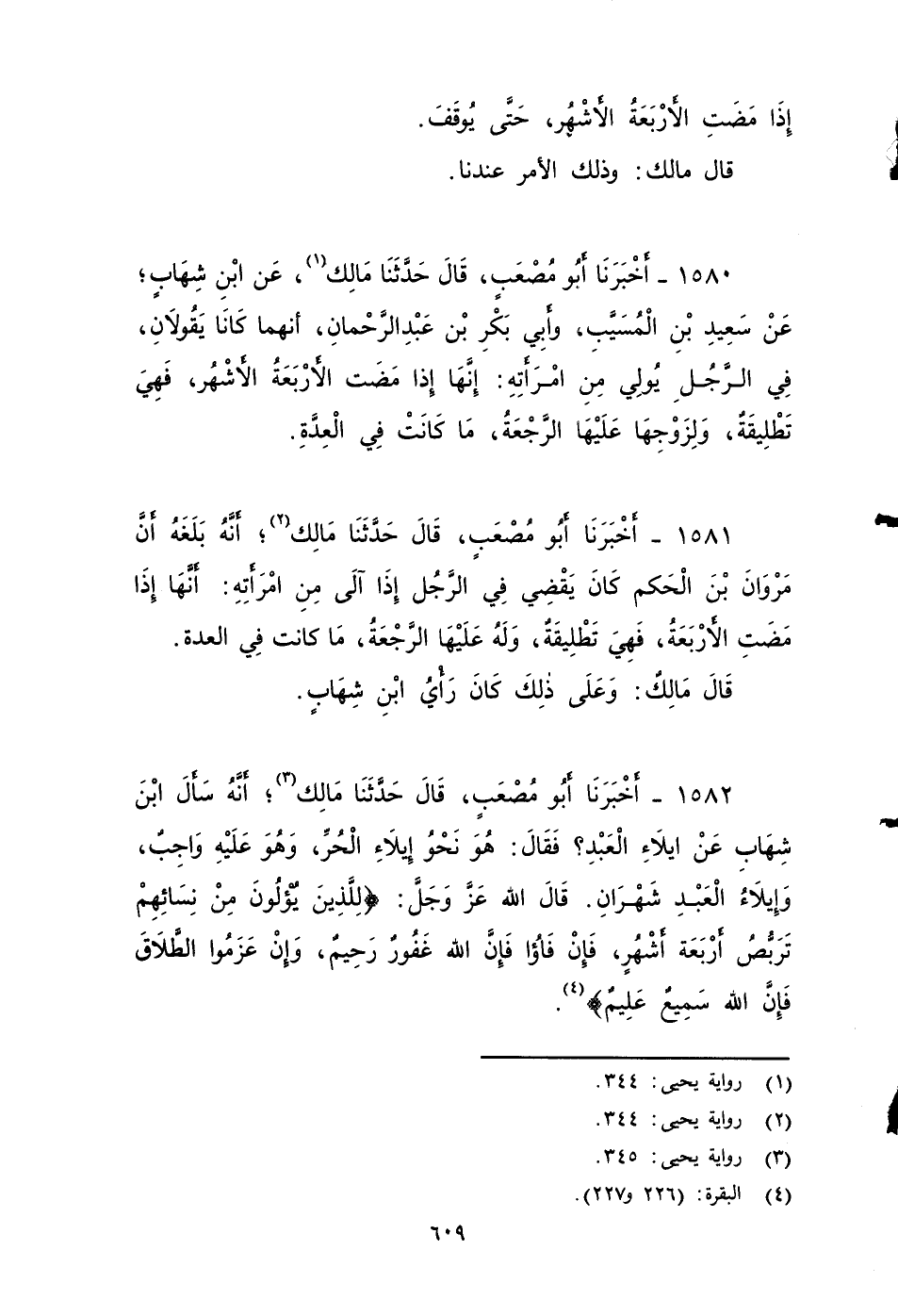 ١٥٨٠ - أَخْبَرَنَا أَبُو مُصْعَبٍ، قَالَ: حَدَّثَنَا مَالِكٌ، عَنِ ابْنِ شِهَابٍ، عنَّ سَعِيدَ بْنَ الْمُسَيَّبِ، وَأَبَي بَكْرِ بْنَ عَبْدِ الرَّحْمَنِ أنهما كَانَا يَقُولَانِ فِي الرَّجُلِ يُولِي مِنِ امْرَأَتِهِ: إِنَّهَا إِذَا مَضَتِ الأََرْبَعَةُ الأََشْهُرِ , فَهِيَ تَطْلِيقَةٌ، وَلِزَوْجِهَا عَلَيْهَا الرَّجْعَةُ مَا كَانَتْ فِي الْعِدَّةِ.