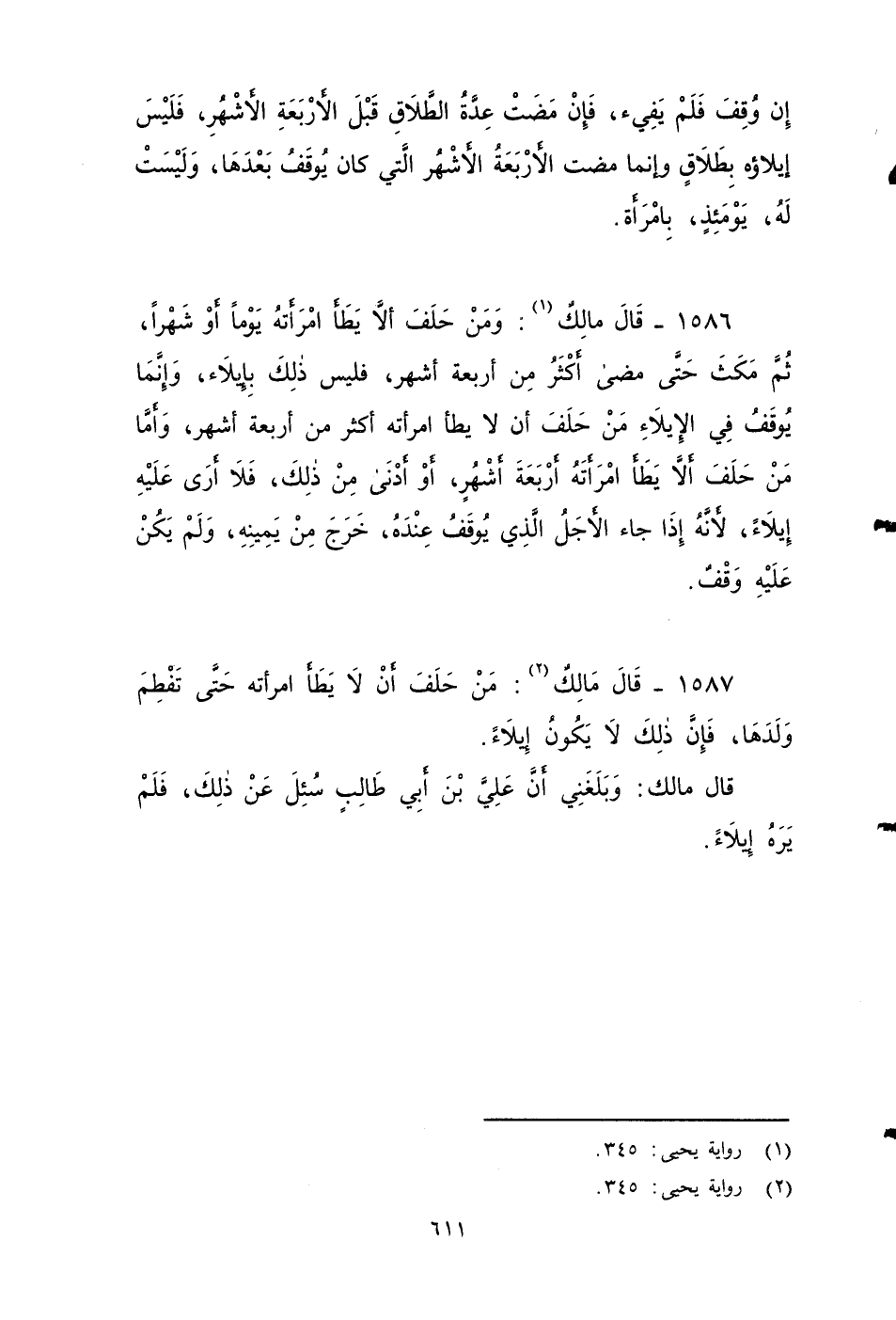١٥٨٦ - قَالَ مَالِكٌ: وَمَنْ حَلَفَ أَنْ لَا يَطَأَ امْرَأَتَهُ يَوْمًا أَوْ شَهْرًا، ثُمَّ مَكَثَ حَتَّى يَنْقَضِيَ أَكْثَرُ مِنَ الأََرْبَعَةِ الأََشْهُرِ، فَلَا يَكُونُ ذَلِكَ إِيلَاءً، وَإِنَّمَا يُوقَفُ فِي الإِيلَاءِ مَنْ حَلَفَ عَلَى أَكْثَرَ مِنَ الأََرْبَعَةِ الأََشْهُرِ، فَأَمَّا مَنْ حَلَفَ أَنْ لَا يَطَأَ امْرَأَتَهُ أَرْبَعَةَ أَشْهُرٍ وأَوْ أَدْنَى مِنْ ذَلِكَ، فَلَا أَرَى عَلَيْهِ إِيلَاءً , لأَنَّهُ إِذَا جَاءَ الأََجَلُ الَّذِي يُوقَفُ عِنْدَهُ , خَرَجَ مِنْ يَمِينِهِ , وَلَمْ يَكُنْ عَلَيْهِ وَقْفٌ.