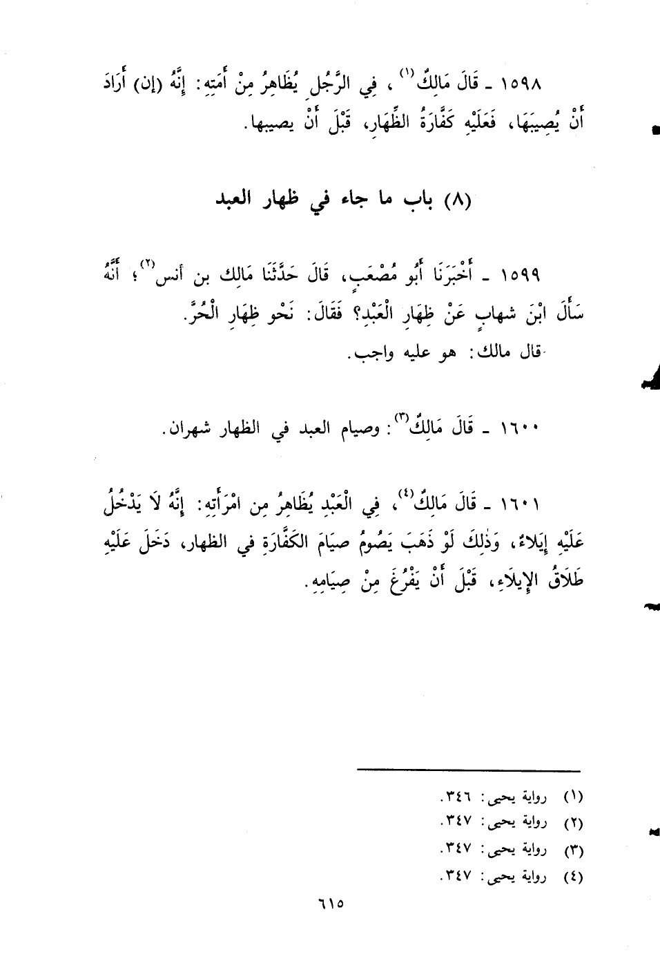 ١٦٠٠ - قَالَ مَالِكٌ: وَصِيَامُ الْعَبْدِ فِي الظِّهَارِ شَهْرَانِ.