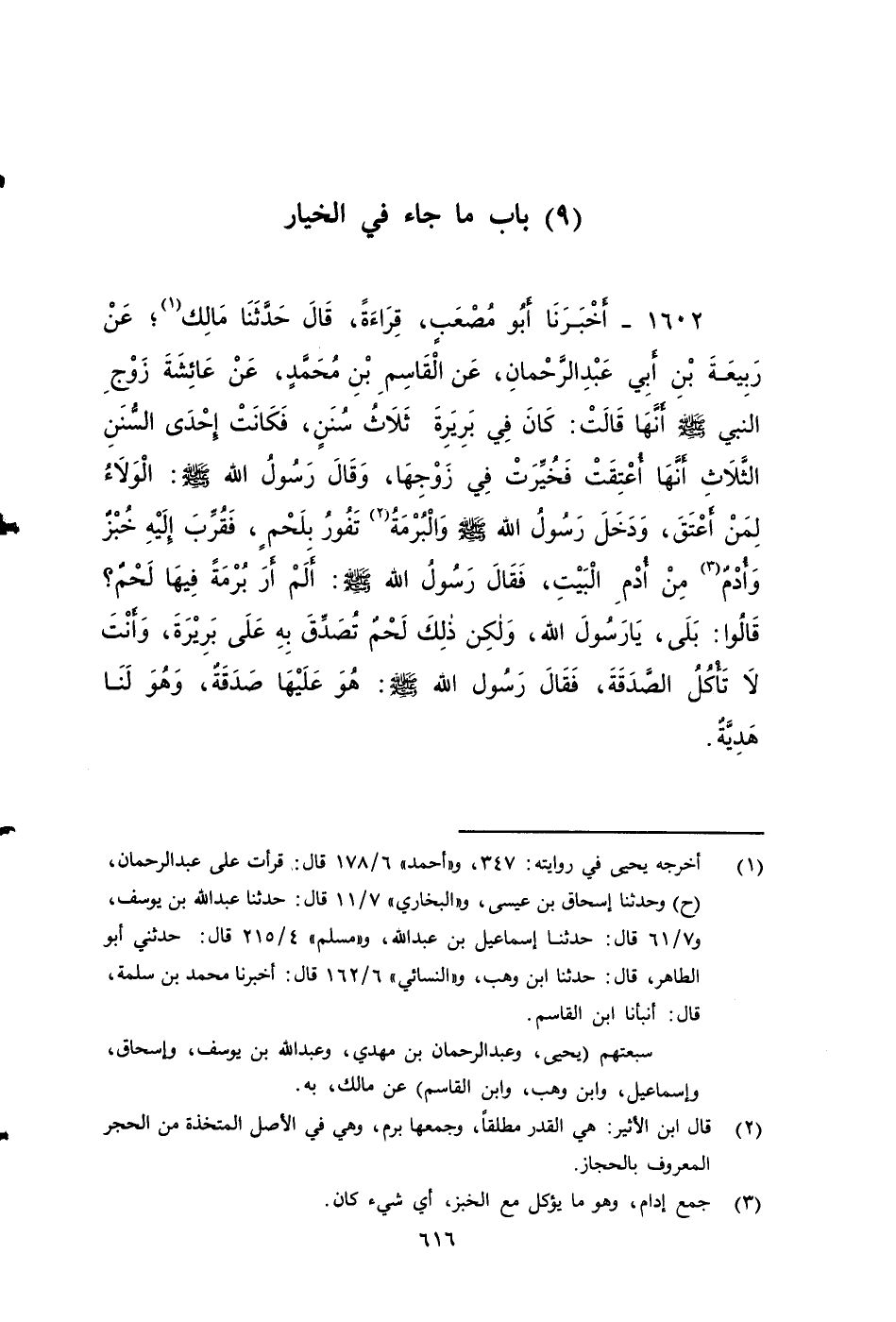 ١٦٠٢ - أخبرنَا أَبُو مُصْعَبٍ قراءة، قَالَ: حَدَّثَنَا مَالِكٌ، عَنْ رَبِيعَةَ بْنِ أَبِي عَبْدِ الرَّحْمَنِ، عَنِ الْقَاسِمِ بْنِ مُحَمَّدٍ، عَنْ عَائِشَةَ زوج النبي صَلَّى اللَّهُ عَلَيْهِ وَسَلَمَ، أَنَّهَا قَالَتْ: كَانَ فِي بَرِيرَةَ ثَلَاثُ سُنَنٍ، فَكَانَتْ إِحْدَى السُّنَنِ الثَّلَاثِ أَنَّهَا أُعْتِقَتْ، فَخُيِّرَتْ فِي زَوْجِهَا، وَقَالَ رَسُولُ اللَّهِ صَلَّى اللَّهُ عَلَيْهِ وَسَلَمَ: الْوَلَاءُ لِمَنْ أَعْتَقَ، وَدَخَلَ رَسُولُ اللَّهِ صَلَّى اللَّهُ عَلَيْهِ وَسَلَمَ، وَالْبُرْمَةُ تَفُورُ بِلَحْمٍ، فَقُرِّبَ إِلَيْهِ خُبْزٌ، وَأُدْمٌ مِنْ أُدْمِ الْبَيْتِ، فَقَالَ رَسُولُ اللَّهِ صَلَّى اللَّهُ عَلَيْهِ وَسَلَمَ: أَلَمْ أَرَ بُرْمَةً فِيهَا لَحْمٌ؟ قَالُوا: بَلَى يَا رَسُولَ اللَّهِ، وَلَكِنْ ذَلِكَ لَحْمٌ تُصُدِّقَ بِهِ عَلَى بَرِيرَةَ، وَأَنْتَ لا تَأْكُلُ الصَّدَقَةَ، فَقَالَ رَسُولُ اللَّهِ صَلَّى اللَّهُ عَلَيْهِ وَسَلَمَ: هُوَ عَلَيْهَا صَدَقَةٌ، وَهُوَ لَنَا هَدِيَّةٌ.