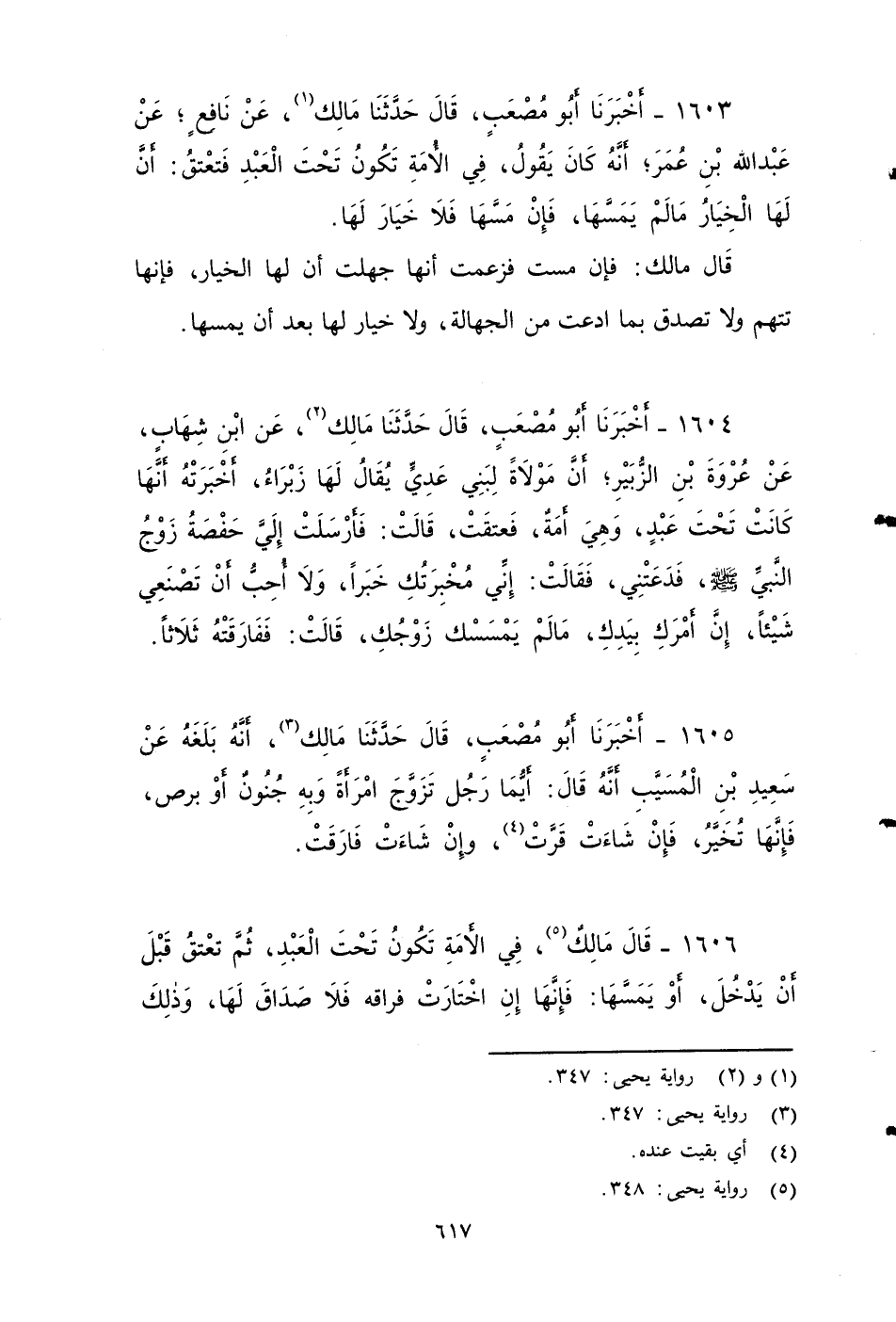 ١٦٠٤ - أخبرنَا أَبُو مُصْعَبٍ، قَالَ: حَدَّثَنَا مَالِكٌ، عَنِ ابْنِ شِهَابٍ، عَنْ عُرْوَةَ بْنِ الزُّبَيْرِ , أَنَّ مَوْلَاةً لِبَنِي عَدِيٍّ , يُقَالُ لَهَا: زَبْرَاءُ، أَخْبَرَتْهُ أَنَّهَا كَانَتْ تَحْتَ عَبْدٍ، وَهِيَ أَمَةٌ، فَعَتَقَتْ، قَالَتْ: فَأَرْسَلَتْ إِلَيَّ حَفْصَةُ , زَوْجُ النَّبِيِّ صَلَّى اللَّهُ عَلَيْهِ وَسَلَّمَ , فَدَعَتْنِي، فَقَالَتْ: إِنِّي مُخْبِرَتُكِ خَبَرًا، وَلَا أُحِبُّ أَنْ تَصْنَعِي شَيْئًا، إِنَّ أَمْرَكِ بِيَدِكِ، مَا لَمْ يَمْسَسْكِ زَوْجُكِ، قَالَتْ: فَفَارَقَتْهُ ثَلَاثًا.