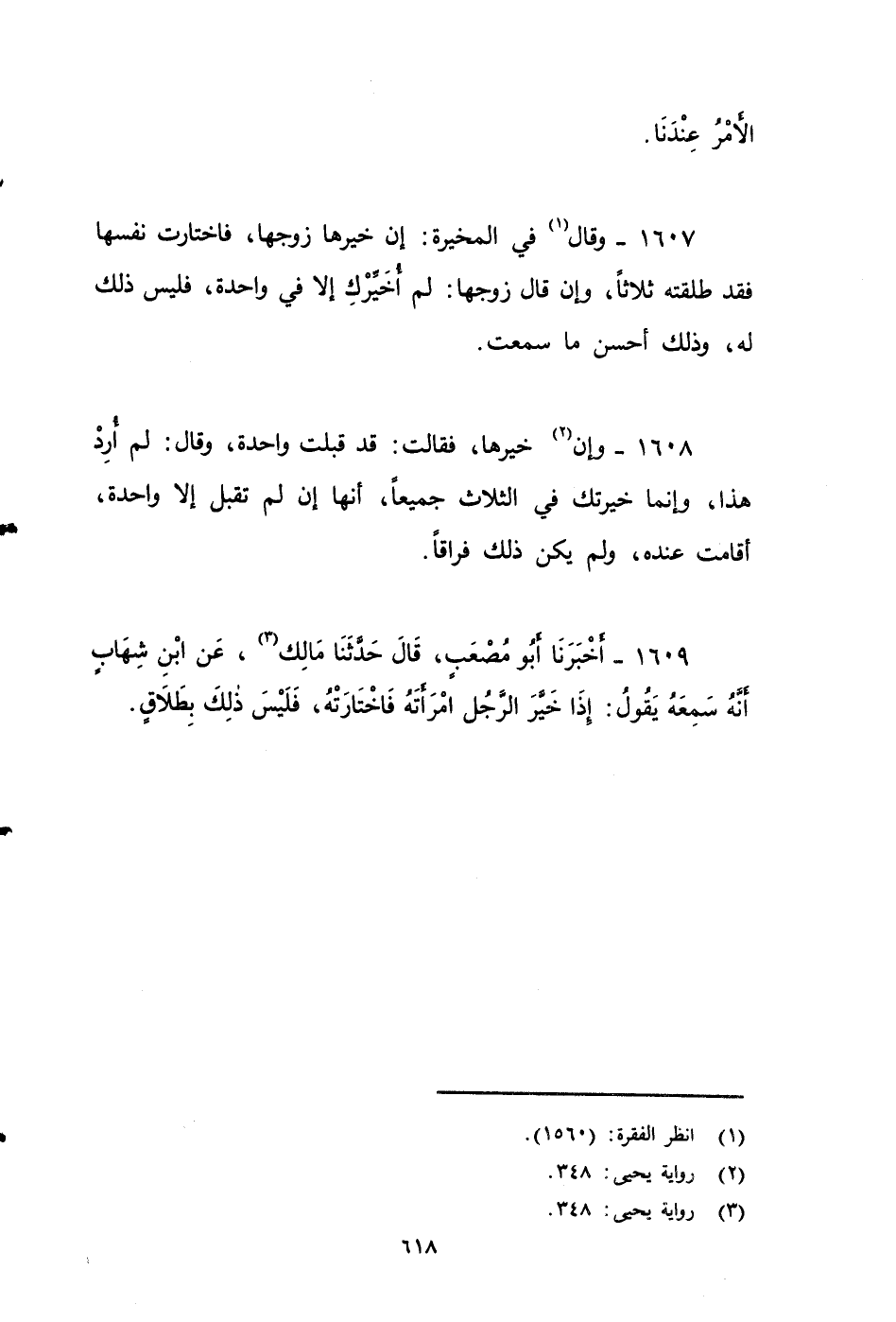 ١٦٠٩ - أخبرنَا أَبُو مُصْعَبٍ، قَالَ: حَدَّثَنَا مَالِكٌ , عَنِ ابْنِ شِهَابٍ، أَنَّهُ سَمِعَهُ يَقُولُ: إِذَا خَيَّرَ الرَّجُلُ امْرَأَتَهُ، فَاخْتَارَتْهُ، فَلَيْسَ ذَلِكَ بِطَلَاقٍ.