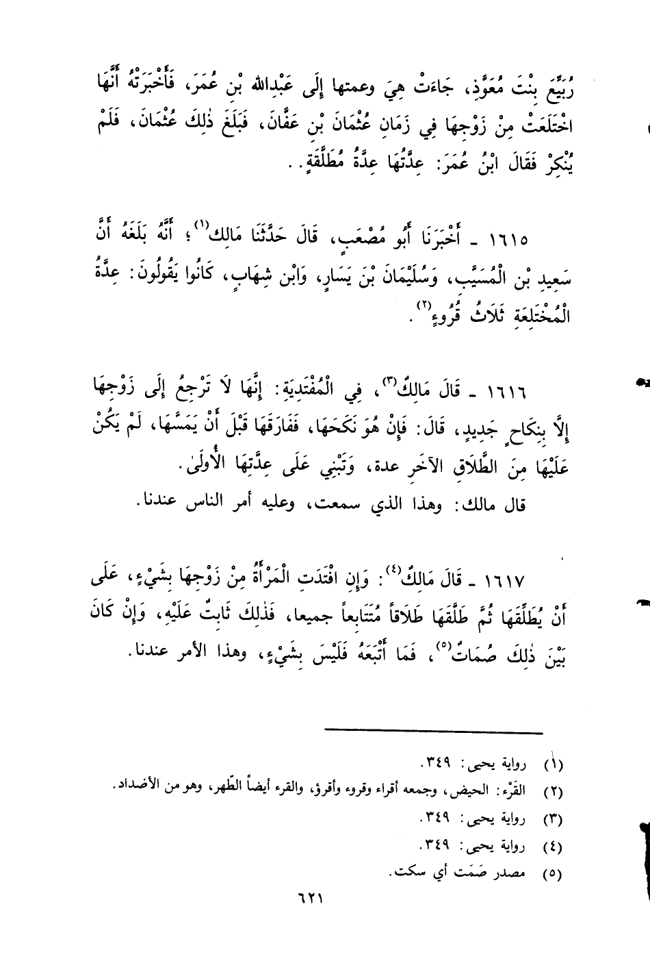 ١٦١٥ - أخبرنَا أَبُو مُصْعَبٍ، قَالَ: حَدَّثَنَا مَالِكٌ؛ أَنَّهُ بَلَغَهُ , أَنَّ سَعِيدَ بْنَ الْمُسَيَّبِ، وَسُلَيْمَانَ بْنَ يَسَارٍ , وَابْنَ شِهَابٍ كَانُوا يَقُولُونَ: عِدَّةُ الْمُخْتَلِعَةِ , ثَلَاثَةُ قُرُوءٍ.