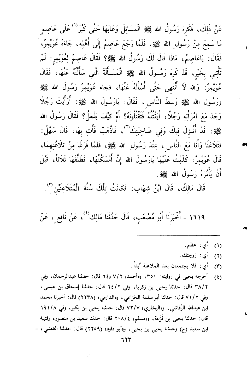 ١٦١٩ - أخبرنَا أَبُو مُصْعَبٍ، قَالَ: حَدَّثَنَا مَالِكٌ، عَنْ نَافِعٍ، عَنْ عَبْدِ اللَّهِ بْنِ عُمَرَ أَنَّ رَجُلًا لَاعَنَ امْرَأَتَهُ فِي زَمَانِ رَسُولِ اللَّهِ صَلَّى اللَّهُ عَلَيْهِ وَسَلَمَ، وَانْتَفَى مِنْ وَلَدِهَا، فَفَرَّقَ رَسُولُ اللَّهِ صَلَّى اللَّهُ عَلَيْهِ وَسَلَمَ بَيْنَهُمَا، وَأَلْحَقَ الْوَلَدَ بِالْمَرْأَةِ.