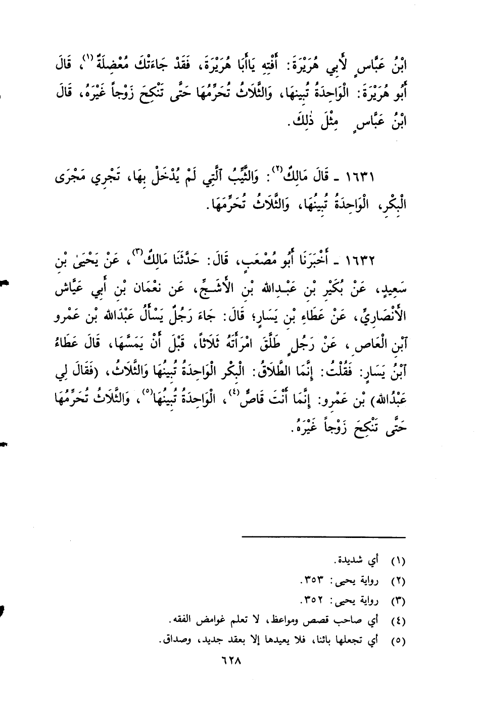 ١٦٣٢ - أخبرنا أَبُو مُصْعَبٍ، قَالَ: حَدَّثَنَا مَالِكٌ، عَنْ يَحْيَى بْنِ سَعِيدٍ، عَنْ بُكَيْرِ بْنِ عَبْدِ اللهِ بْنِ الأََشَجِّ، عَنِ النُّعْمَانِ بْنِ أَبِي عَيَّاشٍ الأََنْصَارِيِّ، عَنْ عَطَاءِ بْنِ يَسَارٍ، قَالَ: جَاءَ رَجُلٌ يَسْأَلُ عَبْدَ اللهِ بْنَ عَمْرِو بْنِ الْعَاصِ عَنْ رَجُلٍ طَلَّقَ امْرَأَتَهُ ثَلَاثًا , قَبْلَ أَنْ يَمَسَّهَا؟ قَالَ عَطَاءٌ بن يسار: فَقُلْتُ: إِنَّمَا الطَلَاقُ الْبِكْرِ الوَاحِدَةٌ تبينها والثلاث، فَقَالَ لِي عَبْدُ اللهِ بْنُ عَمْرِو بْنِ الْعَاصِ: إِنَّمَا أَنْتَ قَاصٌّ , الْوَاحِدَةُ تُبِينُهَا، وَالثَّلَاثَةُ تُحَرِّمُهَا , حَتَّى تَنْكِحَ زَوْجًا غَيْرَهُ.