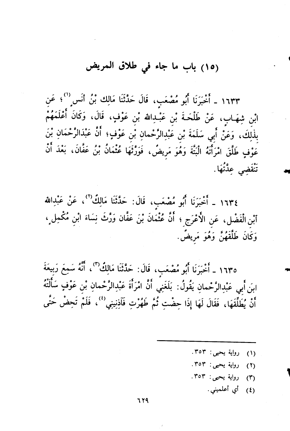 ١٦٣٣ - أخبرنا أَبُو مُصْعَبٍ، قَالَ: حَدَّثَنَا مَالِكٌ بن أنس، عَنِ ابْنِ شِهَابٍ، عَنْ طَلْحَةَ بْنِ عَبْدِ اللهِ بْنِ عَوْفٍ، قَالَ: وَكَانَ أَعْلَمَهُمْ بِذَلِكَ، وَعَنْ أَبِي سَلَمَةَ بْنِ عَبْدِ الرَّحْمَنِ بْنِ عَوْفٍ، أَنَّ عَبْدَ الرَّحْمَنِ بْنَ عَوْفٍ طَلَّقَ امْرَأَتَهُ الْبَتَّةَ وَهُوَ مَرِيضٌ، فَوَرَّثَهَا عُثْمَانُ بْنُ عَفَّانَ مِنْهُ , بَعْدَ أن تنْقِضي عِدَّتِهَا.