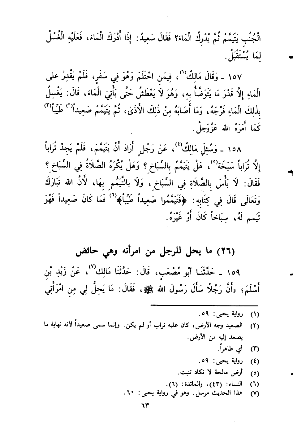 ١٥٩ - حَدَّثَنَا أَبُو مُصْعَبٍ، قَالَ: حَدَّثَنَا مَالِكٌ، عَنْ زَيْدِ بْنِ أَسْلَمَ، أَنَّ رَجُلًا سَأَلَ رَسُولَ اللَّهِ صَلى الله عَلَيه وَسَلم، فَقَالَ: مَا يَحِلُّ لِي مِنَ امْرَأَتِي وَهِيَ حَائِضٌ؟ فَقَالَ النبي صَلى الله عَلَيه وَسَلم: لِتَشُدَّ عَلَيْهَا إِزَارَهَا، ثُمَّ شَأْنَكَ بِأَعْلَاهَا.