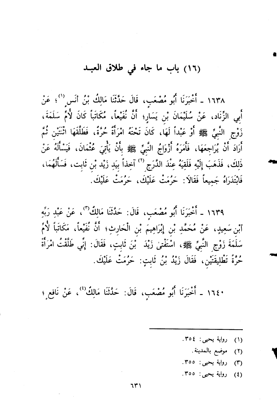 ١٦٣٨ - أخبرنا أَبُو مُصْعَبٍ، قَالَ: حَدَّثَنَا مَالِكٌ بن أنس، عَنْ أَبِي الزِّنَادِ، عَنْ سُلَيْمَانَ بْنِ يَسَارٍ، أَنَّ نُفَيْعًا مُكَاتَبًا كَانَ لأُمِّ سَلَمَةَ , زَوْجِ النَّبِيِّ صَلَّى اللَّهُ عَلَيْهِ وَسَلَّمَ , أَوْ عَبْدًا لَهَا , كَانَتْ تَحْتَهُ امْرَأَةٌ حُرَّةٌ , فَطَلَّقَهَا اثْنَتَيْنِ، ثُمَّ أَرَادَ أَنْ يُرَاجِعَهَا، فَأَمَرَهُ أَزْوَاجُ النَّبِيِّ صَلَّى اللَّهُ عَلَيْهِ وَسَلَّمَ بأَنْ يَأْتِيَ عُثْمَانَ , فَيَسْأَلَهُ عَنْ ذَلِكَ، فَلَقِيَهُ عِنْدَ الدَّرَجِ , آخِذًا بِيَدِ زَيْدِ بْنِ ثَابِتٍ , فَسَأَلَهُمَا , فَابْتَدَرَاهُ جَمِيعًا , فَقَالَا: حَرُمَتْ عَلَيْكَ , حَرُمَتْ عَلَيْكَ.