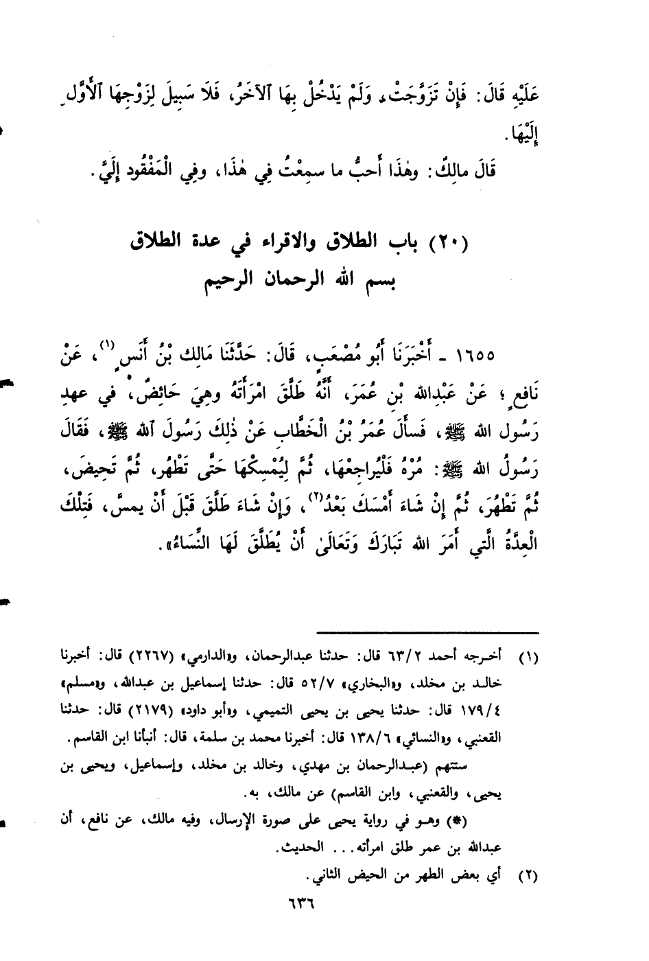١٦٥٥ - أخبرنا أَبُو مُصْعَبٍ، قَالَ: حَدَّثَنَا مَالِكٌ بن أنس، عَنْ نَافِعٍ، عن عَبْدَ اللَّهِ بْنَ عُمَرَ، أَنَّهُ طَلَّقَ امْرَأَتَهُ , وَهِْيَ حَائِضٌ , فِي عَهْدِ رَسُولِ اللهِ صَلَّى اللَّهُ عَلَيْهِ وَسَلَمَ , فَسَأَلَ عُمَرُ بْنُ الْخَطَّابِ عَنْ ذَلِكَ رَسُولَ اللهِ صَلَّى اللَّهُ عَلَيْهِ وَسَلَمَ، فَقَالَ رَسُولُ اللهِ صَلَّى اللَّهُ عَلَيْهِ وَسَلَمَ: مُرْهُ فَلْيُرَاجِعْهَا , ثُمَّ لْيُمْسِكْهَا حَتَّى تَطْهُرَ , ثُمَّ تَحِيضَ , ثُمَّ تَطْهُرَ , ثُمَّ إِنْ شَاءَ أَمْسَكَ بَعْدُ , وَإِنْ شَاءَ طَلَّقَ قَبْلَ أَنْ يَمَسَّ , فَتِلْكَ الْعِدَّةُ الَّتِي أَمَرَ اللَّهُ تبارك وتعالى أَنْ يُطَلَّقَ لَهَا النِّسَاءُ.