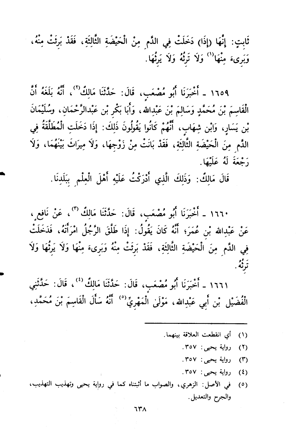 ١٦٥٩ - أخبرنا أَبُو مُصْعَبٍ، قَالَ: حَدَّثَنَا مَالِكٌ؛ أَنَّهُ بَلَغَهُ عَنِ الْقَاسِمِ بْنِ مُحَمَّدٍ , وَسَالِمِ بْنِ عَبْدِ اللهِ , وَأَبِي بَكْرِ بْنِ عَبْدِ الرَّحْمَنِ، وَسُلَيْمَانَ بْنِ يَسَارٍ، وَابْنِ شِهَابٍ، أَنَّهُمْ كَانُوا يَقُولُونَ ذلك: إِذَا دَخَلَتِ الْمُطَلَّقَةُ فِي الدَّمِ مِنَ الْحَيْضَةِ الثَّالِثَةِ، فَقَدْ بَانَتْ مِنْ زَوْجِهَا، وَلَا مِيرَاثَ بَيْنَهُمَا , وَلَا رَجْعَةَ لَهُ عَلَيْهَا. قال مالك: وذلك اذي أدركت عليه أهل العلم ببلدنا.