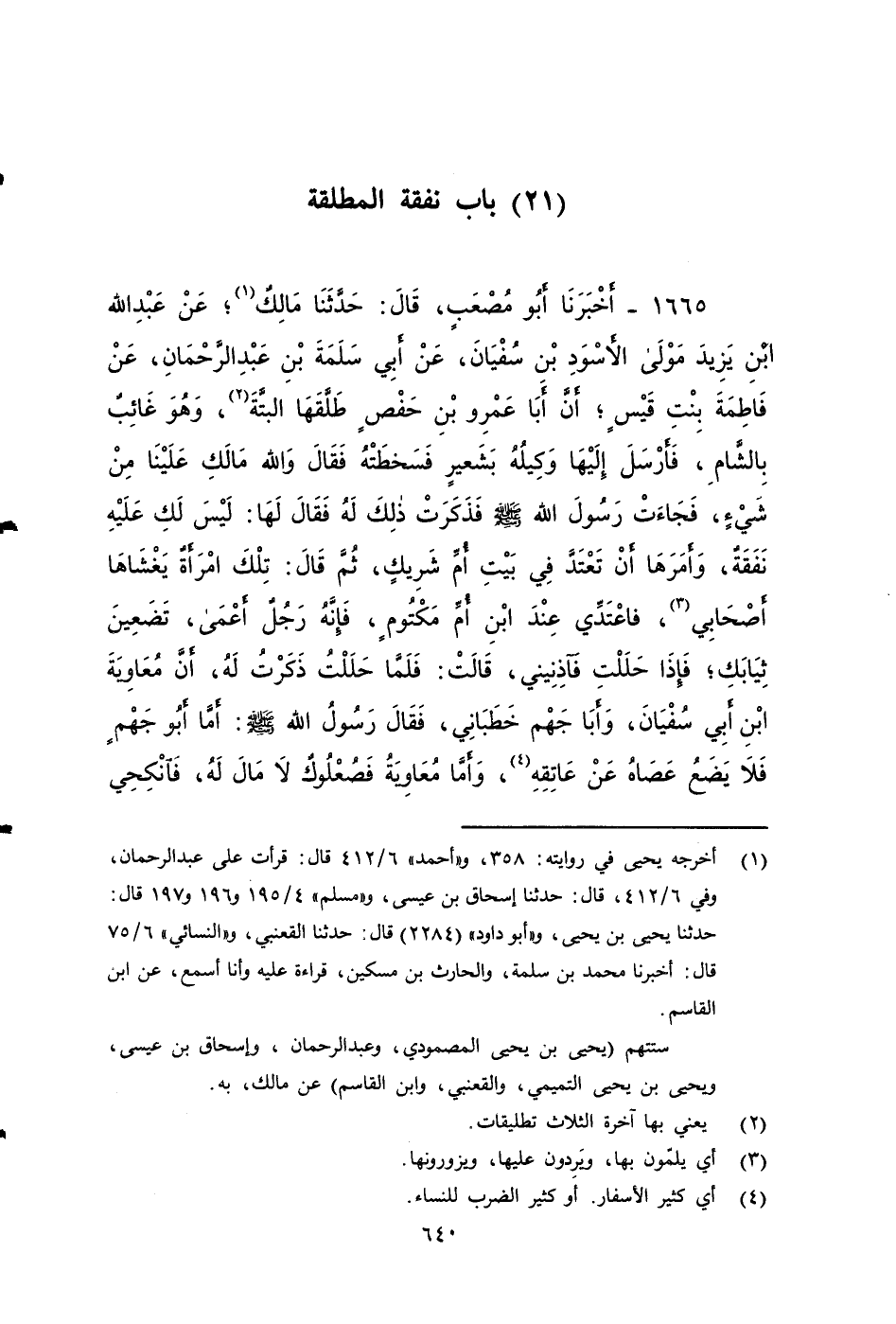 ١٦٦٥ - أخبرنا أَبُو مُصْعَبٍ، قَالَ: حَدَّثَنَا مَالِكٌ، عَنْ عَبْدِ اللَّهِ بْنِ يَزِيدَ مَوْلَى الأَسْوَدِ بْنِ سُفْيَانَ، عَنْ أَبِي سَلَمَةَ بْنِ عَبْدِ الرَّحْمَنِ، عَنْ فَاطِمَةَ بِنْتِ قَيْسٍ أَنَّ أَبَا عَمْرِو بْنَ حَفْصٍ طَلَّقَهَا الْبَتَّةَ، وَهُوَ غَائِبٌ بِالشَّامِ، فَأَرْسَلَ إِلَيْهَا وَكِيلُهُ بِشَعِيرٍ، فَسَخِطَتْهُ، فَقَالَ: وَاللَّهِ مَا لَكِ عَلَيْنَا مِنْ شَيْءٍ، فَجَاءَتْ رَسُولِ اللَّهِ صَلَّى اللَّهُ عَلَيْهِ وَسَلَمَ، فَذَكَرَتْ ذَلِكَ لَهُ، فَقَالَ لها: لَيْسَ لَكِ عَلَيْهِ نَفَقَةٌ، وَأَمَرَهَا: أَنْ تَعْتَدَّ فِي بَيْتِ أُمِّ شَرِيكٍ، ثُمَّ قَالَ: تِلْكَ امْرَأَةٌ يَغْشَاهَا أَصْحَابِي، فاعْتَدِّي عِنْدَ ابْنِ أُمِّ مَكْتُومٍ، فَإِنَّهُ رَجُلٌ أَعْمَى، تَضَعِينَ ثِيَابَكِ، فَإِذَا حَلَلْتِ فَآذِنِينِي، قَالَتْ: فَلَمَّا حَلَلْتُ ذَكَرْتُ لَهُ: أَنَّ مُعَاوِيَةَ بْنَ أَبِي سُفْيَانَ، وَأَبَا جَهْم خَطَبَانِي، فَقَالَ رَسُولُ اللَّهِ صَلَّى اللَّهُ عَلَيْهِ وَسَلَمَ: أَمَّا أَبُو جَهْمٍ، فَلَا يَضَعُ عَصَاهُ عَنْ عَاتِقِهِ، وَأَمَّا مُعَاوِيَةُ فَصُعْلُوكٌ، لا مَالَ لَهُ، فانْكِحِي أُسَامَةَ بْنَ زَيْدٍ، قَالَتْ: فَكَرِهْتُهُ، ثُمَّ قَالَ: انْكِحِي أُسَامَةَ بْنَ زَيْدٍ، فَنَكَحْتُهُ، فَجَعَلَ اللَّهُ فِيه خَيْرًا، وَاغْتَبَطْتُ بِهِ.