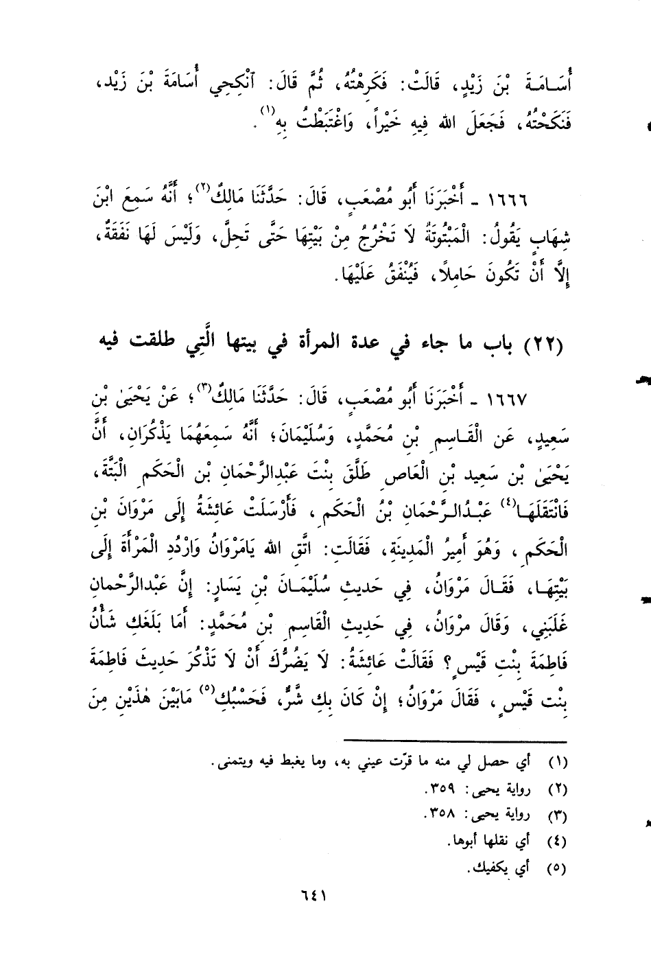 ١٦٦٧ - أخبرنا أَبُو مُصْعَبٍ، قَالَ: حَدَّثَنَا مَالِكٌ، عَنْ يَحْيَى بْنِ سَعِيدٍ، عَنِ الْقَاسِمِ بْنِ مُحَمَّدٍ , وَسُلَيْمَانَ , أَنَّهُ سَمِعَهُمَا يَذْكُرَانِ , أَنَّ يَحْيَى بْنَ سَعِيدِ بْنِ الْعَاصِ طَلَّقَ بْنَت عَبْدِ الرَّحْمَنِ بْنِ الْحَكَمِ الْبَتَّةَ، فَانْتَقَلَهَا عَبْدُ الرَّحْمَنِ بْنُ الْحَكَمِ، فَأَرْسَلَتْ عَائِشَةُ إِلَى مَرْوَانَ بْنِ الْحَكَمِ , وَهُوَ أَمِيرُ الْمَدِينَةِ , فقَالَتِ: اتَّقِ اللَّهَ يامَرْوَانَ وَارْدُدِ الْمَرْأَةَ إِلَى بَيْتِهَا، فَقَالَ مَرْوَانُ فِي حَدِيثِ سُلَيْمَانَ بن يسار: إِنَّ عَبْدَ الرَّحْمَنِ غَلَبَنِي، وَقَالَ مَرْوَانُ فِي حَدِيثِ الْقَاسِمِ بن محمد: أَمَا بَلَغَكِ شَأْنُ فَاطِمَةَ بِنْتِ قَيْسٍ؟ فَقَالَتْ عَائِشَةُ: لَا يَضُرُّكَ أَنْ لَا تَذْكُرَ حَدِيثَ فَاطِمَةَ بِنْتِ قَيْسٍ، فَقَالَ مَرْوَانُ: إِنْ كَانَ بِكِ شَّرُّ , فَحَسْبُكِ مَا بَيْنَ هَذَيْنِ مِنَ الشَّرِّ.