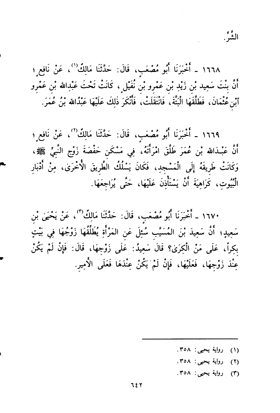 ١٦٦٩ - أخبرنا أَبُو مُصْعَبٍ، قَالَ: حَدَّثَنَا مَالِكٌ، عَنْ نَافِعٍ، أَنَّ عَبْدَ اللهِ بْنَ عُمَرَ طَلَّقَ امْرَأَته فِي مَسْكَنِ حَفْصَةَ , زَوْجِ النَّبِيِّ صَلَّى اللَّهُ عَلَيْهِ وَسَلَّمَ، وَكَانَت طَرِيقَهُ إِلَى الْمَسْجِدِ، فَكَانَ يَسْلُكُ الطَّرِيقَ الأَُخْرَى مِنْ أَدْبَارِ الْبُيُوتِ، كَرَاهِيَةَ أَنْ يَسْتَأْذِنَ عَلَيْهَا حَتَّى يرَاجَعَهَا.