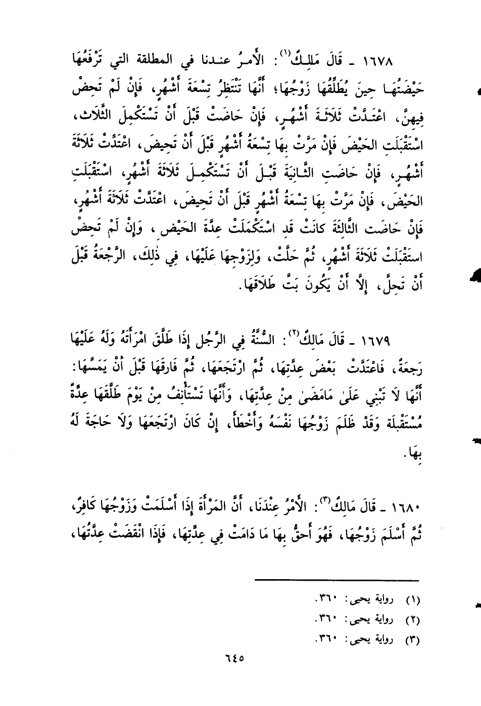 ١٦٧٨ - قَالَ مَالِكٌ: الأََمْرُ عِنْدَنَا فِي الْمُطَلَّقَةِ الَّتِي تَرْفَعُهَا حَيْضَتُهَا حِينَ يُطَلِّقُهَا زَوْجُهَا، أَنَّهَا تَنْتَظِرُ تِسْعَةَ أَشْهُرٍ، فَإِنْ لَمْ تَحِضْ فِيهِنَّ اعْتَدَّتْ ثَلَاثَةَ أَشْهُرٍ، فَإِنْ حَاضَتْ قَبْلَ أَنْ تَسْتَكْمِلَ الثَّلَاثَ، اسْتَقْبَلَتِ الْحَيْضَ، فَإِنْ مَرَّتْ بِهَا تِسْعَةُ أَشْهُرٍ قَبْلَ أَنْ تَحِيضَ، اعْتَدَّتْ ثَلَاثَةَ أَشْهُرٍ، فَإِنْ حَاضَتِ الثَّانِيَةَ قَبْلَ أَنْ تَسْتَكْمِلَ ثَّلَاثَةَ أشْهُرَ، اسْتَقْبَلَتِ الْحَيْضَ، فَإِنْ مَرَّتْ بِهَا تِسْعَةُ أَشْهُرٍ قَبْلَ أَنْ تَحِيضَ , اعْتَدَّتْ ثَلَاثَةَ أَشْهُرٍ، فَإِنْ حَاضَتِ الثَّالِثَةَ , كَانَتْ قَدِ اسْتَكْمَلَتْ عِدَّةَ الْحَيْضِ، وإِنْ لَمْ تَحِضِ اسْتَقْبَلَتْ ثَلَاثَةَ أَشْهُرٍ، ثُمَّ حَلَّتْ، وَلِزَوْجِهَا عَلَيْهَا فِي ذَلِكَ الرَّجْعَةُ , قَبْلَ أَنْ تَحِلَّ , إِلَاّ أَنْ يَكُونَ قَدْ بَتَّ طَلَاقَهَا.