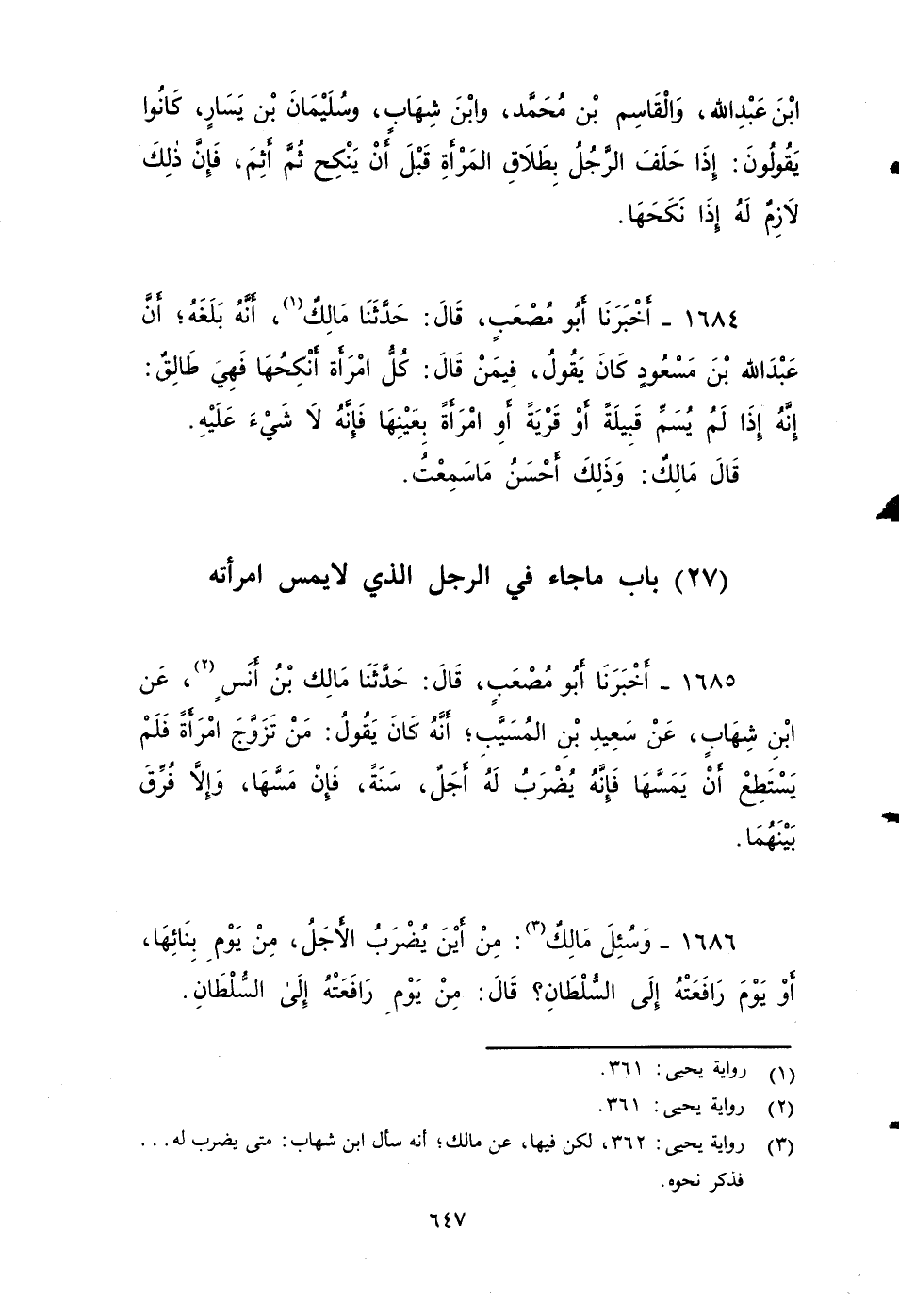 ١٦٨٤ - أخبرنا أَبُو مُصْعَبٍ، قَالَ: حَدَّثَنَا مَالِكٌ؛ أَنَّهُ بَلَغَهُ، أَنَّ عَبْدَ اللهِ بْنَ مَسْعُودٍ كَانَ يَقُولُ فِيمَنْ قَالَ: كُلُّ امْرَأَةٍ أَنْكِحُهَا فَهِيَ طَالِقٌ، إِنَّهُ إِذَا لَمْ يُسَمِّ قَبِيلَةً أوقرية أَوِ امْرَأَةً بِعَيْنِهَا , فَإنه لَا شَيْءَ عَلَيْهِ.