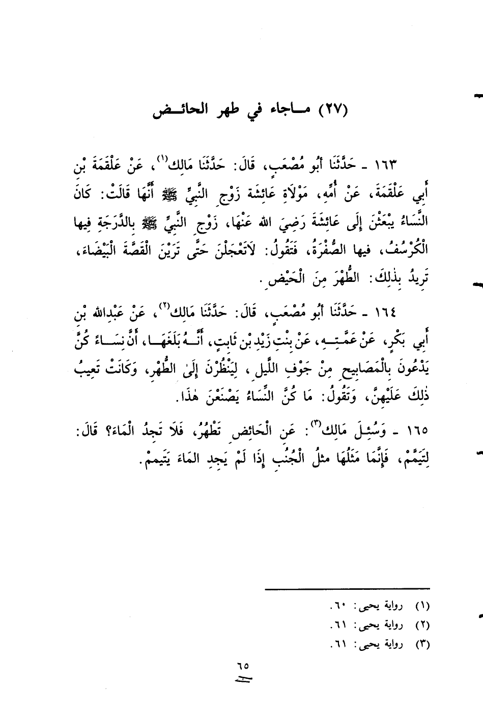 ١٦٣ - حَدَّثَنَا أَبُو مُصْعَبٍ، قَالَ: حَدَّثَنَا مَالِكٌ، عَنْ عَلْقَمَةَ بْنِ أَبِي عَلْقَمَةَ، عَنْ أُمِّهِ , مَوْلَاةِ عَائِشَةَ زَوْجَ النَّبِيِّ صَلى الله عَلَيه وَسَلم، أَنَّهَا قَالَتْ: كَانَ النِّسَاءُ يَبْعَثْنَ إِلَى عَائِشَةَ - رضي الله عنها - زَوْجَ النَّبِيِّ صَلى الله عَلَيه وَسَلم بِالدِّرَجَةِ فِيهَا الْكُرْسُفُ، فِيهِا الصُّفْرَةُ فَتَقُولُ: لَا تَعْجَلْنَ حَتَّى تَرَيْنَ الْقَصَّةَ الْبَيْضَاءَ، تُرِيدُ بِذَلِكَ الطُّهْرَ مِنَ الْحَيْضَ.