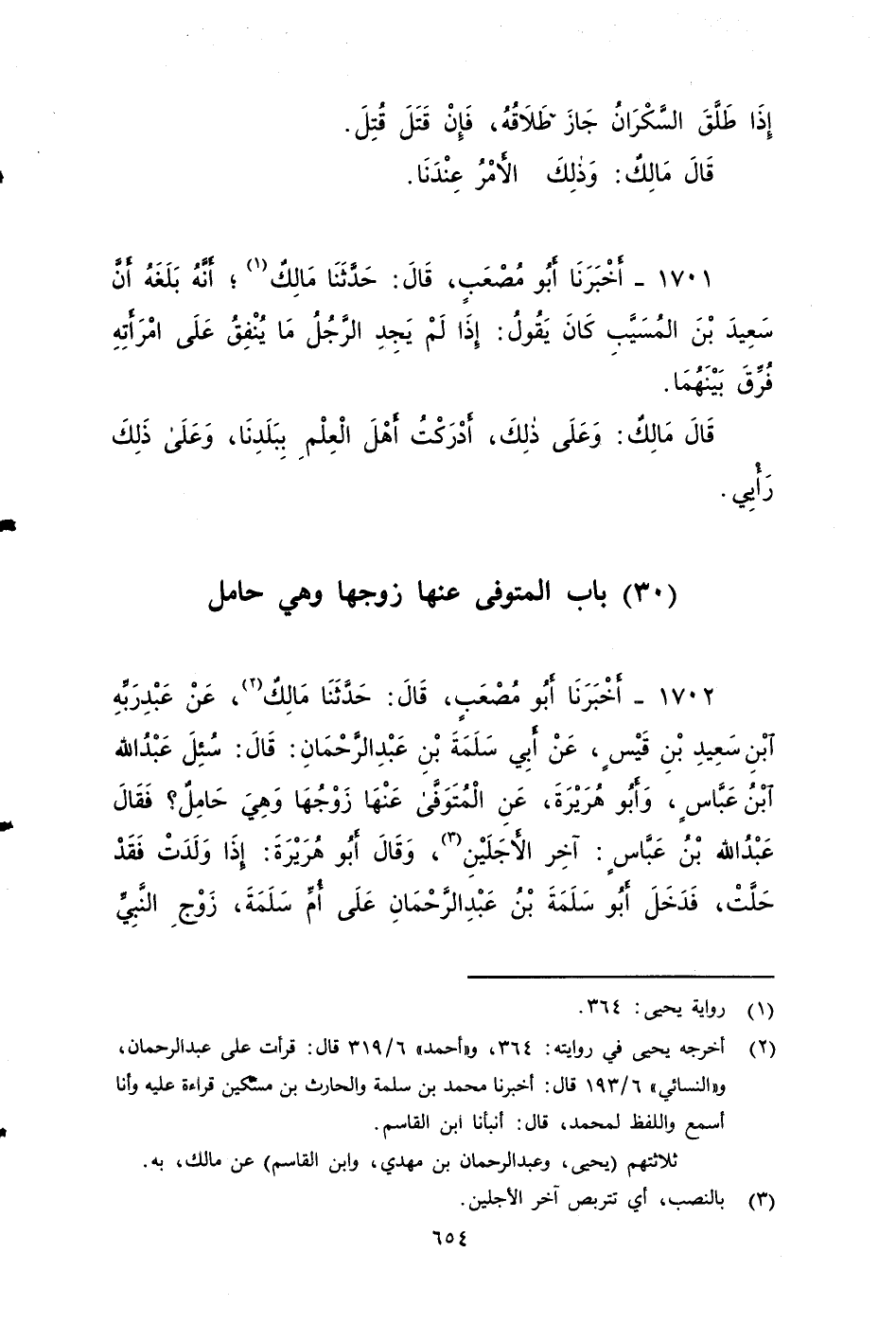 ١٧٠٢ - أخبرنا أَبُو مُصْعَبٍ، قَالَ: حَدَّثَنَا مَالِكٌ، عَنْ عَبْدِ رَبِّهِ بْنِ سَعِيدِ بْنِ قَيْسٍ، عَنْ أَبِي سَلَمَةَ بْنِ عَبْدِ الرَّحْمَنِ، قَالَ: سُئِلَ عَبْدُ اللَّهِ بْنُ عَبَّاسٍ، وَأَبُو هُرَيْرَةَ، عَنِ المتَوَفَّى عَنْهَا زَوْجُهَا وهي حامل؟ فَقَالَ عبد الله بْنُ عَبَّاسٍ: آخِرَ الأَجَلَيْنِ، وَقَالَ أَبُو هُرَيْرَةَ: إِذَا وَلَدَتْ فَقَدْ حَلَّتْ، فَدَخَلَ أَبُو سَلَمَةَ بْنُ عَبْدِ الرَّحْمَنِ عَلَى أُمِّ سَلَمَةَ زَوْجِ النَّبِيِّ صَلَّى اللَّهُ عَلَيْهِ وَسَلَمَ، فَسَأَلَهَا عَنْ ذَلِكَ؟ فَقَالَتْ: وَلَدَتْ سُبَيْعَةُ الأَسْلَمِيَّةُ بَعْدَ وَفَاةِ زَوْجِهَا بِنِصْفِ شَهْرٍ، فَخَطَبَهَا رَجُلَانِ، أَحَدُهُمَا: شَابٌّ، وَالْآخَرُ: كَهْلٌ، فَحَطَّتْ إِلَى الشَّابِّ، فَقَالَ الكهل: لَمْ تَحِلِلْ، وَكَانَ أَهْلُهَا غَيْبًا، وَرَجَا إِذَا جَاءَ أَهْلُهَا أَنْ يُؤْثِرُوهُ بِهَا، فَجَاءَتْ رَسُولَ اللَّهِ صَلَّى اللَّهُ عَلَيْهِ وَسَلَمَ، فَقَالَ: قَدْ حَلَلْتِ، فَانْكِحِي مَنْ شِئْتِ.