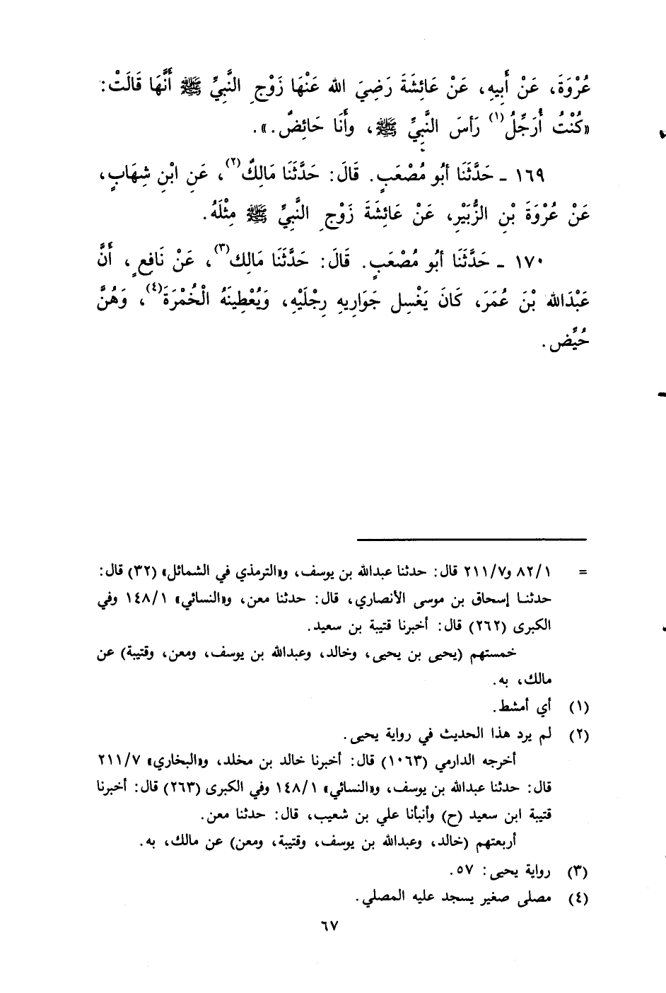 ١٦٨ - حَدَّثَنَا أَبُو مُصْعَبٍ، قَالَ: حَدَّثَنَا مَالِكٌ، عَنْ هِشَامِ بْنِ عُرْوَةَ، عَنْ أَبِيهِ، عَنْ عَائِشَةَ رَضِيَ اللَّهُ عَنْهَا زَوْجَ النَّبِيِّ صَلى الله عَلَيه وَسَلم، أَنَّهَا قَالَتْ: كُنْتُ أُرَجِّلُ رَأْسَ النبي صَلى الله عَلَيه وَسَلم وَأَنَا حَائِضٌ.