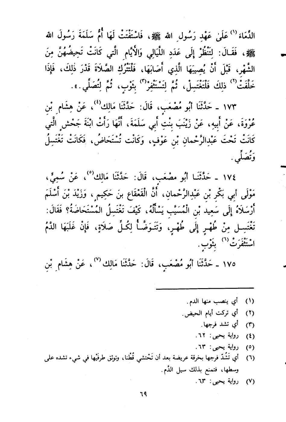 ١٧٥ - حَدَّثَنَا أَبُو مُصْعَبٍ، قَالَ: حَدَّثَنَا مَالِكٌ، عَنْ هِشَامِ بْنِ عُرْوَةَ، عَنْ أَبِيهِ، أَنَّهُ قَالَ: لَيْسَ عَلَى الْمُسْتَحَاضَةِ إِلَاّ أَنْ تَغْتَسِلَ غُسْلاً وَاحِدًا، ثُمَّ تَتَوَضَّأُ بَعْدَ ذَلِكَ للصَلَاةٍ.