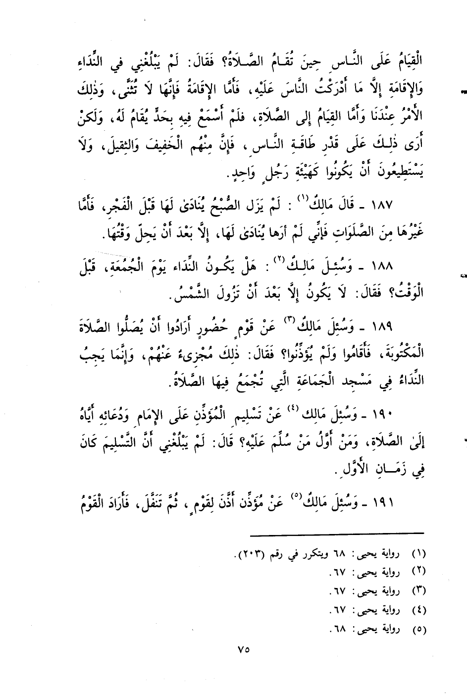 ١٩٠ - وَسُئِلَ مَالِكٌ عَنْ تَسْلِيمِ الْمُؤَذِّنِ عَلَى الإِمَامِ، وَدُعَائِهِ إِيَّاهُ الى الصَّلَاةِ، وَمَنْ أَوَّلُ مَنْ سُلِّمَ عَلَيْهِ؟ قَالَ: لَمْ يَبْلُغْنِي أَنَّ التَّسْلِيمَ كَانَ فِي زَّمَانِ الأََوَّلِ.