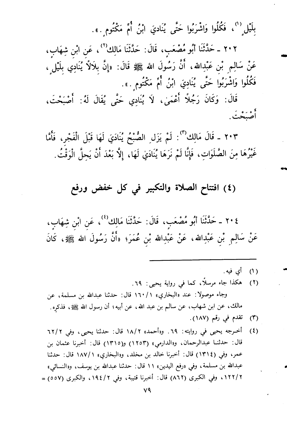 ٢٠٢ - حَدَّثَنَا أَبُو مُصْعَبٍ، قَالَ: حَدَّثَنَا مَالِكٌ، عَنِ ابْنِ شِهَابٍ، عَنْ سَالِمِ بْنِ عَبْدِ اللَّهِ، أَنَّ رَسُولَ اللَّهِ صَلى الله عَلَيه وَسَلم، قَالَ: إِنَّ بِلَالًا يُنَادِي بِلَيْلٍ، فَكُلُوا وَاشْرَبُوا حَتَّى يُنَادِيَ ابْنُ أُمِّ مَكْتُومٍ قَالَ: وَكَانَ رَجُلًا أَعْمَى لا يُنَادِي، حَتَّى يُقَالَ لَهُ: أَصْبَحْتَ أصبحت.