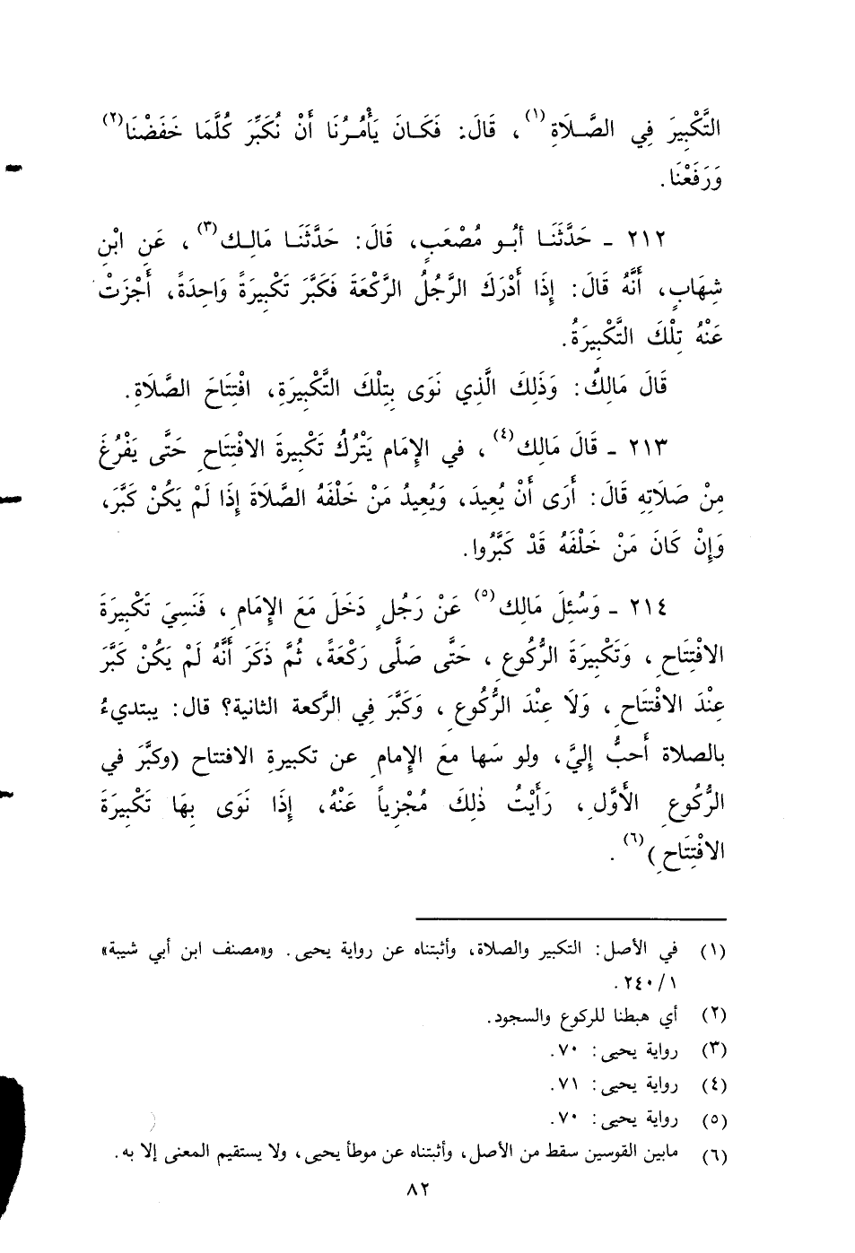 ٢١٤ - وَسُئِلَ مَالِكٌ عَنْ رَجُلٍ دَخَلَ مَعَ الإِمَامِ، فَنَسِيَ تَكْبِيرَةَ الاِفْتِتَاحِ، وَتَكْبِيرَةَ الرُّكُوعِ، حَتَّى صَلَّى رَكْعَةً، ثُمَّ ذَكَرَ أَنَّهُ لَمْ يَكُنْ كَبَّرَ عِنْدَ الاِفْتِتَاحِ، وَلَا عِنْدَ الرُّكُوعِ، وَكَبَّرَ فِي الرَّكْعَةِ الثَّانِيَةِ؟ قَالَ: يَبْتَدِئُ صَلَاتَهُ أَحَبُّ إِلَيَّ، وَلَوْ سَهَا مَعَ الإِمَامِ عَنْ تَكْبِيرَةِ الاِفْتِتَاحِ، وَكَبَّرَ فِي الرُّكُوعِ الأََوَّلِ، رَأَيْتُ ذَلِكَ مُجْزِيًا عَنْهُ، إِذَا نَوَى بِهَا تَكْبِيرَةَ الاِفْتِتَاحِ ...