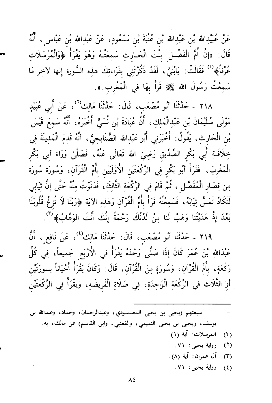 ٢١٨ - حَدَّثَنَا أَبُو مُصْعَبٍ، قَالَ: حَدَّثَنَا مَالِكٌ، عَنْ أَبِي عُبَيْدٍ , مَوْلَى سُلَيْمَانَ بْنِ عَبْدِ الْمَلِكِ، أنْ عُبَادَةَ بْنِ نُسَيٍّ أخبره، أنْه سمع قَيْسِ بْنِ الْحَارِثِ، يقول أخبرني أَبِو عَبْدِ اللهِ الصُّنَابِحِيِّ أَنَّهُ: قَدِمْ الْمَدِينَةَ فِي خِلَافَةِ أَبِي بَكْرٍ الصِّدِّيقِ - رضي الله تعالى عنه - , فَصَلَّى وَرَاءَ أبي بكر الْمَغْرِبَ , فَقَرَأَ أبو بكر فِي الرَّكْعَتَيْنِ الأَُولَيَيْنِ بِأُمِّ الْقُرْآنِ، وَسُورَةٍ: سُورَةٍ مِنْ قِصَارِ الْمُفَصَّلِ، ثُمَّ قَامَ فِي الركعة الثَّالِثَةِ، فَدَنَوْتُ مِنْهُ حَتَّى إِنَّ ثِيَابِي لَتَكَادُ تَمَسَّ ثِيَابَهُ، فَسَمِعْتُهُ قَرَأَ بِأُمِّ الْقُرْآنِ وَهَذِهِ الآيَةِ: {رَبَّنَا لَا تُزِغْ قُلُوبَنَا بَعْدَ إِذْ هَدَيْتَنَا وَهَبْ لَنَا مِنْ لَدُنْكَ رَحْمَةً إِنَّكَ أَنْتَ الْوَهَّابُ} ...