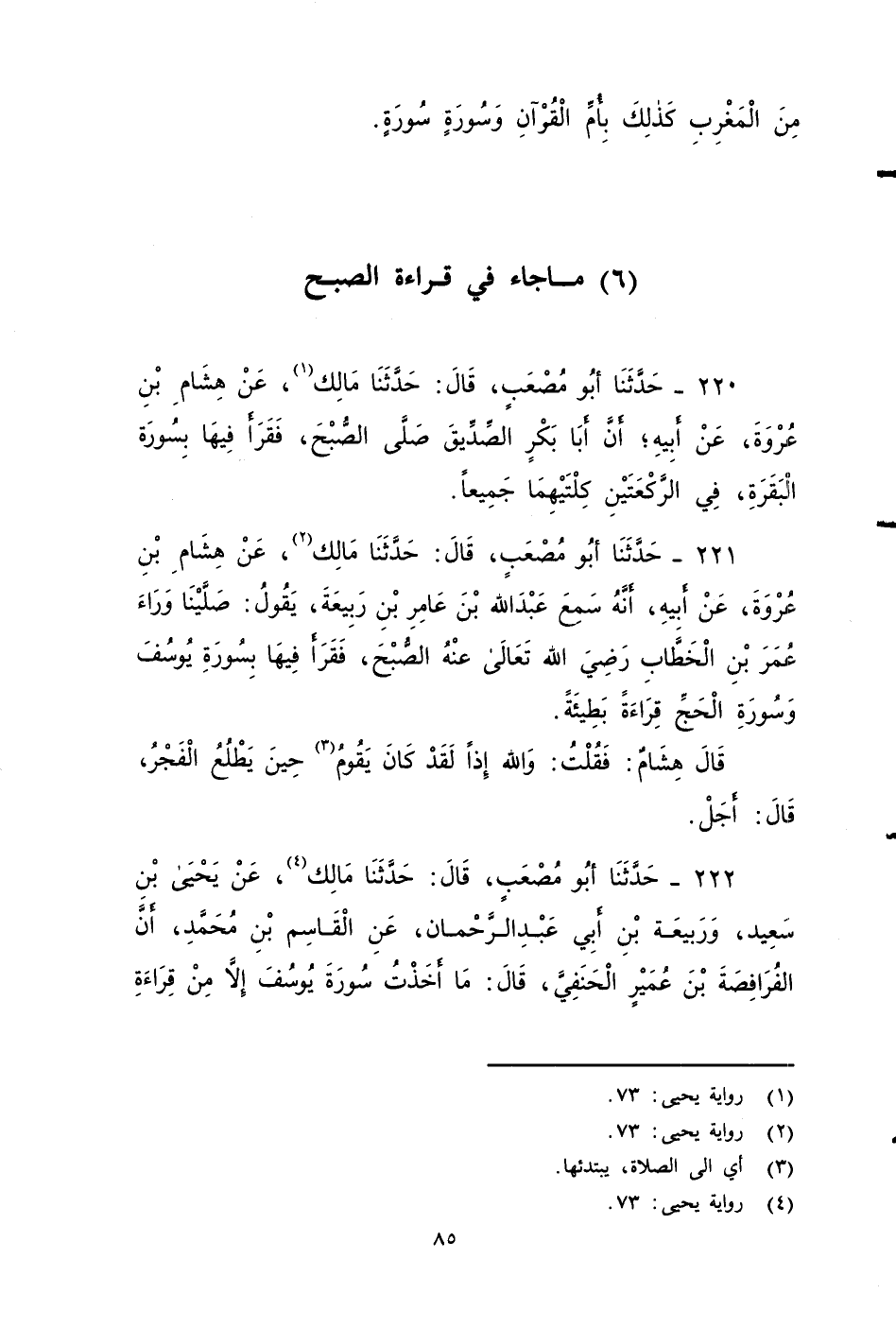 ٢٢١ - حَدَّثَنَا أَبُو مُصْعَبٍ، قَالَ: حَدَّثَنَا مَالِكٌ، عَنْ هِشَامِ بْنِ عُرْوَةَ، عَنْ أَبِيهِ , أَنَّهُ سَمِعَ عَبْدَ اللهِ بْنَ عَامِرِ بْنِ رَبِيعَةَ يَقُولُ: صَلَّيْنَا وَرَاءَ عُمَرَ بْنِ الْخَطَّابِ - رضي الله تعالى عنه - الصُّبْحَ، فَقَرَأَ فِيهَا بِسُورَةِ يُوسُفَ , وَسُورَةِ الْحَجِّ، قِرَاءَةً بَطِيئَةً، قال هشام: فَقُلْتُ: وَاللَّهِ، إِذًا، لَقَدْ كَانَ يَقُومُ حِينَ يَطْلُعُ الْفَجْرُ، قَالَ: أَجَلْ.