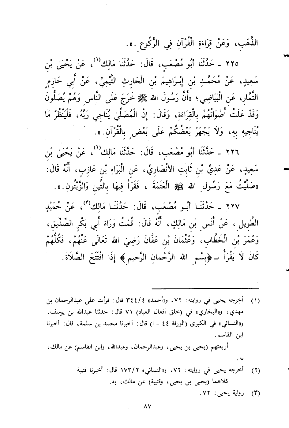 ٢٢٧ - حَدَّثَنَا أَبُو مُصْعَبٍ، قَالَ: حَدَّثَنَا مَالِكٌ، عَنْ حُمَيْدٍ الطَّوِيلِ، عَنْ أَنَسِ بْنِ مَالِكٍ؛ أَنَّهُ قَالَ: قُمْتُ وَرَاءَ أَبِي بَكْرٍالصديق وَعُمَرَ بن الخطاب وَعُثْمَانَ بن عفان - رضي الله تعالى عنهم - , فَكُلُّهُمْ كَانَ لَا يَقْرَأُ ببِسْمِ اللهِ الرَّحْمَنِ الرَّحِيمِ إِذَا افْتَتَحُ الصَّلَاةَ.