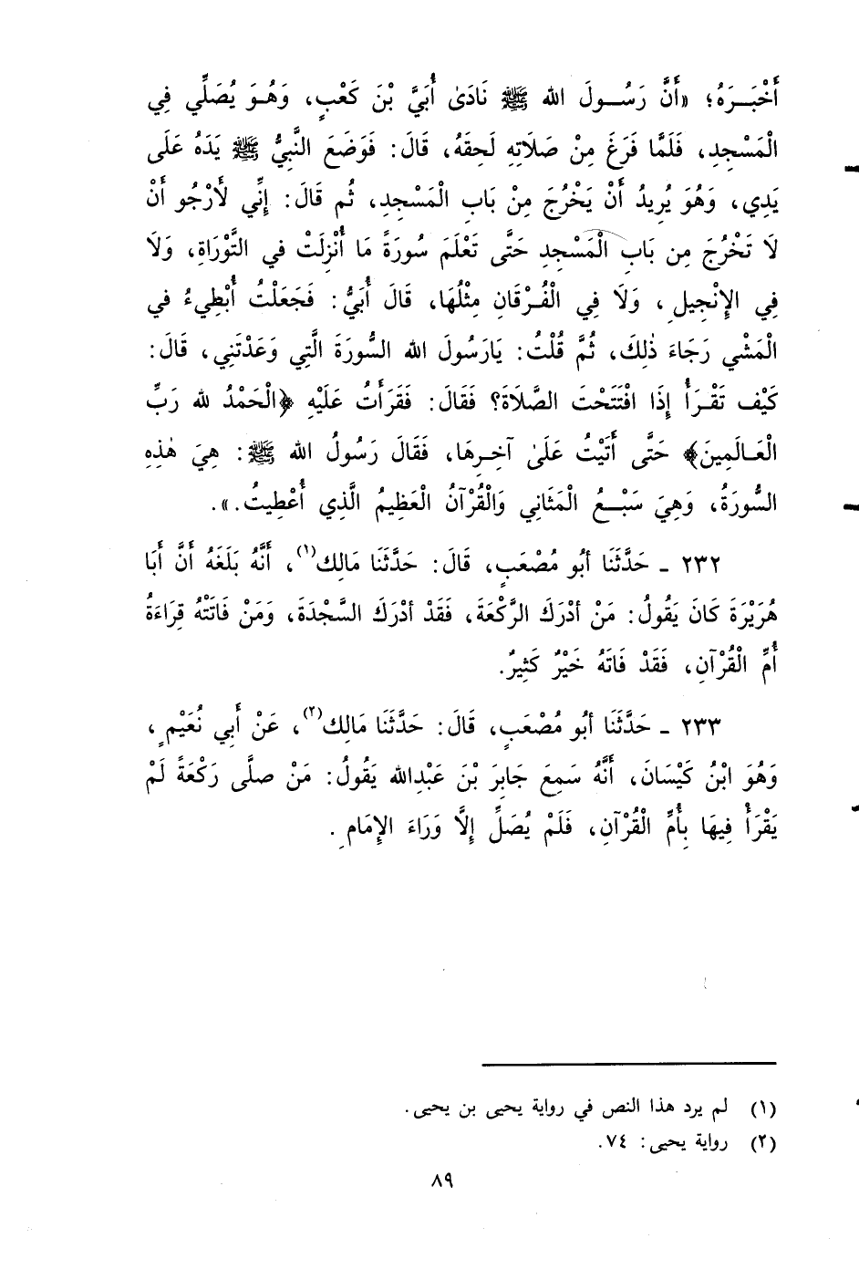 ٢٣٣ - حَدَّثَنَا أَبُو مُصْعَبٍ، قَالَ: حَدَّثَنَا مَالِكٌ، عَنْ أَبِي نُعَيْمٍ وَهْو ابْنِ كَيْسَانَ , أَنَّهُ سَمِعَ جَابِرَ بْنَ عَبْدِ اللهِ يَقُولُ: مَنْ صَلَّى رَكْعَةً لَمْ يَقْرَأْ فِيهَا بِأُمِّ الْقُرْآنِ، فَلَمْ يُصَلِّ إِلَاّ وَرَاءَ الإِمَامِ.