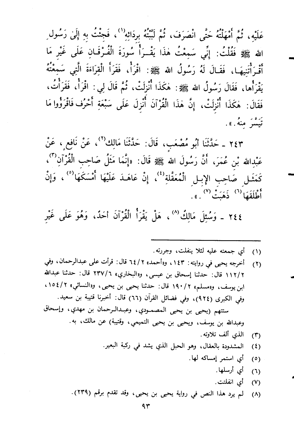 ٢٤٣ - حَدَّثَنَا أَبُو مُصْعَبٍ، قَالَ: حَدَّثَنَا مَالِكٌ، عَنْ نَافِعٍ، عَنْ عَبْدِ اللَّهِ بْنِ عُمَرَ، أَنَّ رَسُولَ اللَّهِ صَلى الله عَلَيه وَسَلم، قَالَ: إِنَّمَا مَثَلُ صَاحِبِ الْقُرْآنِ كَمَثَلِ صَاحِبِ الْإِبِلِ الْمُعَقَّلَةِ، إِنْ عَاهَدَ عَلَيْهَا أَمْسَكَهَا، وَإِنْ أَطْلَقَهَا ذَهَبَتْ.