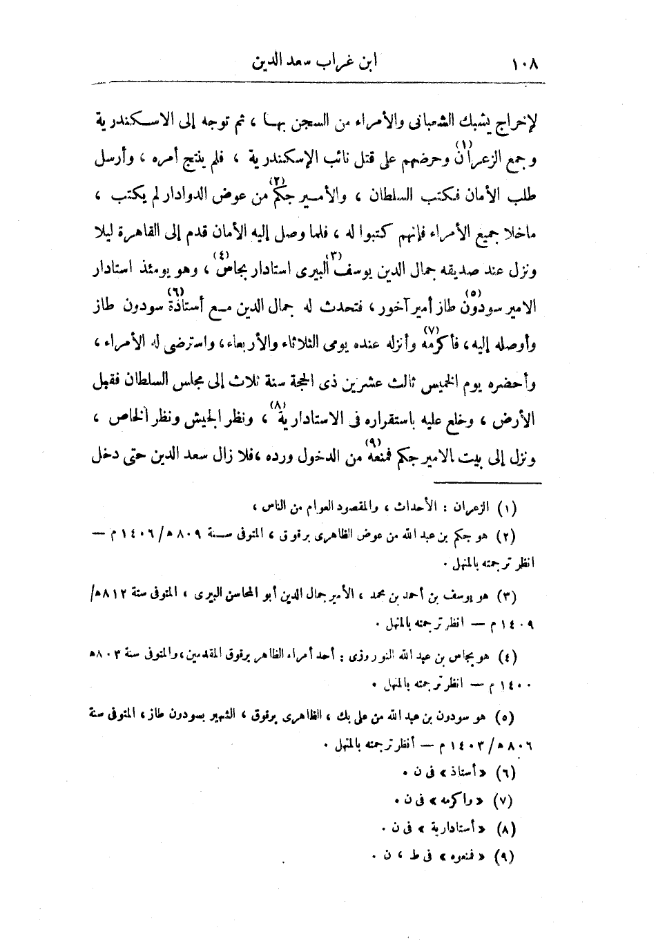 لإخراج يشبك الشعباني والأمراء من السجن بها، ثم توجه إلى الاسكندرية وجمع الزعران وحرضهم على قتل نائب الإسكندرية، فلم ينتج أمره، وأرسل طلب الأمان فكتب السلطان، والأمير جكم من عوض الدوادار لم يكتب، ما خلا جميع الأمراء فإنهم كتبوا له، فلما وصل إليه الأمان قدم إلى القاهرة ليلا ونزل عند صديقه جمال الدين يوسف البيري أستادار بجاس، وهو يومئذ استدار الأمير سودون طاز أمير آخور، فتحدث له جمال الدين مع أستاذة سودون طاز وأوصله إليه، فأكرمه وأنزله عنده يومي الثلاثاء والأربعاء، واسترضى له الأمراء، وأحضره يوم الخميس ثالث عشرين ذي الحجة سنة ثلاث إلى مجلس السلطان فقبل الأرض، وخلع عليه باستقرار في الاستادارية، ونظر الجيش ونظر الخاص، ونزل إلى بيت الأمير جكم فمنعه من الدخول ورده، فلا زال سعد الدين حتى دخل