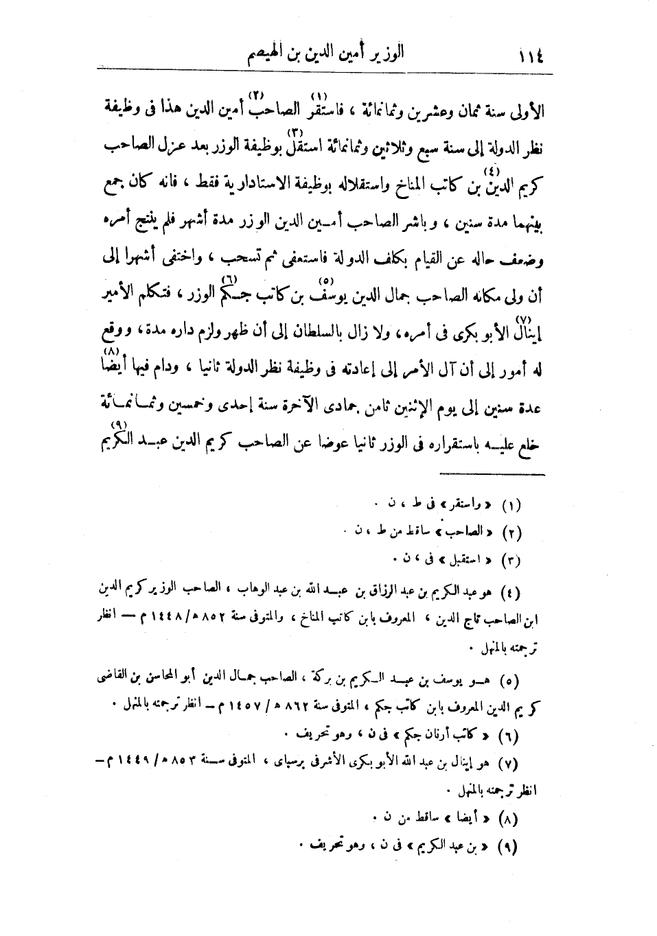 الأولى سنة ثمان وعشرين وثمانمائة، فاستقر الصاحب أمين الدين هذا في وظيفة نظر الدولة إلى سنة سبع وثلاثين وثمانمائة استقل بوظيفة الوزر بعد عزل الصاحب كريم الدين بن كاتب المناخ واستقلاله بوظيفة الاستادارية فقط، فانه كان جمع بينهما مدة سنين، وباشر الصاحب أمين الدين الوزر مدة أشهر فلم ينتج أمره وضعف حاله عن القيام بكلف الدولة فاستعفى ثم تسحب، واختفى أشهرا إلى أن ولي مكانه الصاحب جمال الدين يوسف بن كاتب جكم الوزر، فتكلم الأمير إينال الأبو بكري في أمره، ولا زال بالسلطان إلى أن ظهر ولزم داره مدة، ووقع له أمور إلى أن آل الأمر إلى إعادته في وظيفة نظر الدولة ثانيا، ودام فيها أيضا عدة سنين إلى يوم الاثنين ثامن جمادى الآخرة سنة إحدى وخمسين وثمانمائة خلع عليه باستقراره في الوزر ثانيا عوضا عن الصاحب كريم الدين عبد الكريم