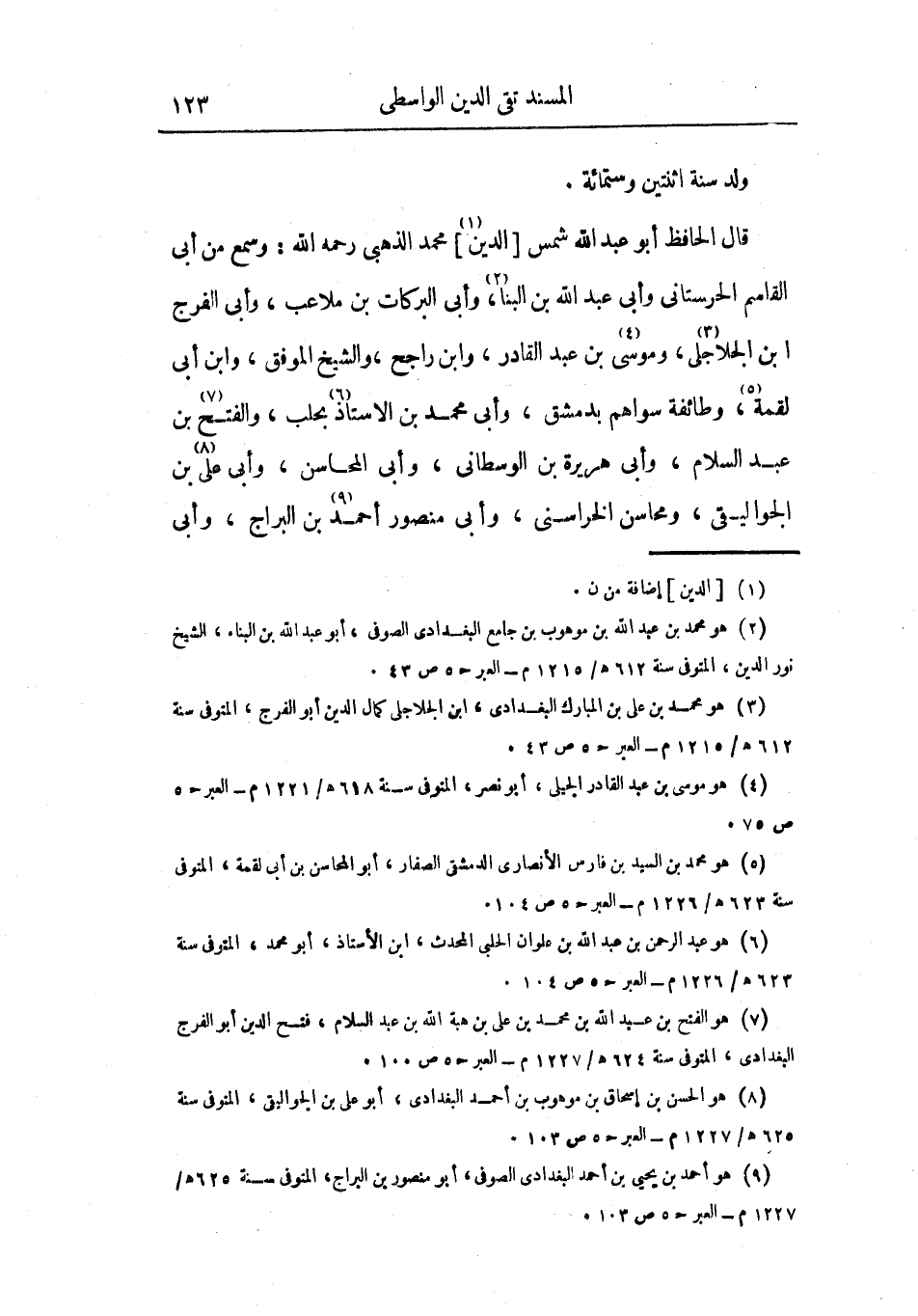 قال الحافظ أبو عبد الله شمس الدين محمد الذهبي رحمه الله، وسمع من أبي القاسم الحرستاني وأبي عبد الله بن البنا، وأبي البركات بن ملاعب، وأبي الفرج ابن الجلاجلي، وموسى بن عبد القادر، وابن راجح، والشيخ الموفق، وابن أبي لقمة، وطائفة سواهم بدمشق، وأبي محمد بن الاستاذ بحلب، والفتح بن عبد السلام، وأبي هريرة بن الوسطاني، وأبي المحاسن، وأبي علي بن الجواليقي، ومحاسن الخراسني، وأبي منصور أحمد بن البراج، وأبي