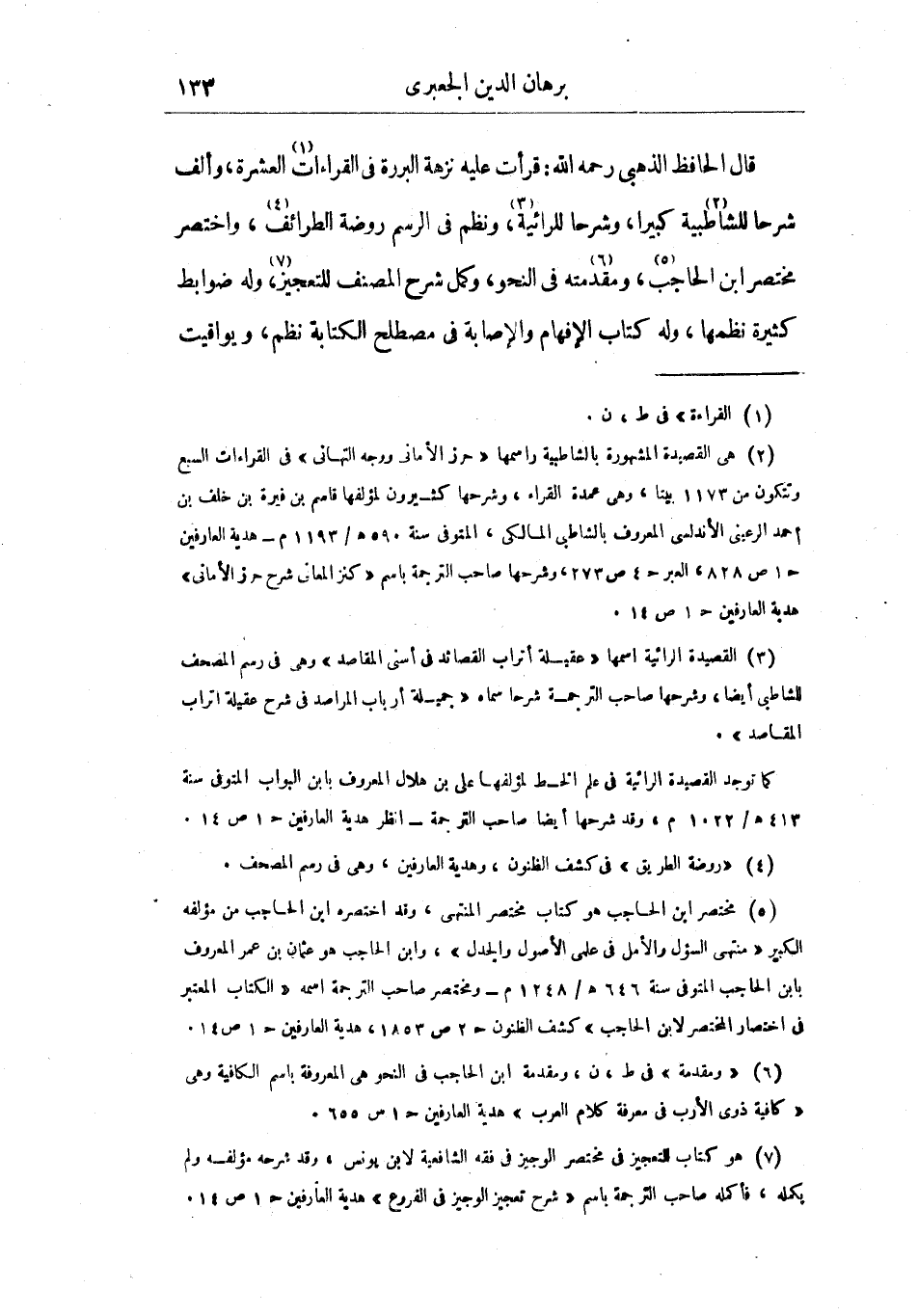 قال الحافظ الذهبي رحمه الله: قرأت عليه نزهة البرزة في القراءات العشرة، وألف شرحا للشاطبية كبيراً، وشرحا للرائية، ونظم في الرسم روضة الطرائف، واختصر مختصر ابن الحاجب، ومقدمته في النحو، وكمل شرح المصنف للتعجيز، وله ضوابط كثيرة نظمها، وله كتاب الإفهام والإصابة في مصطلح الكتابة نظم، ويواقيت