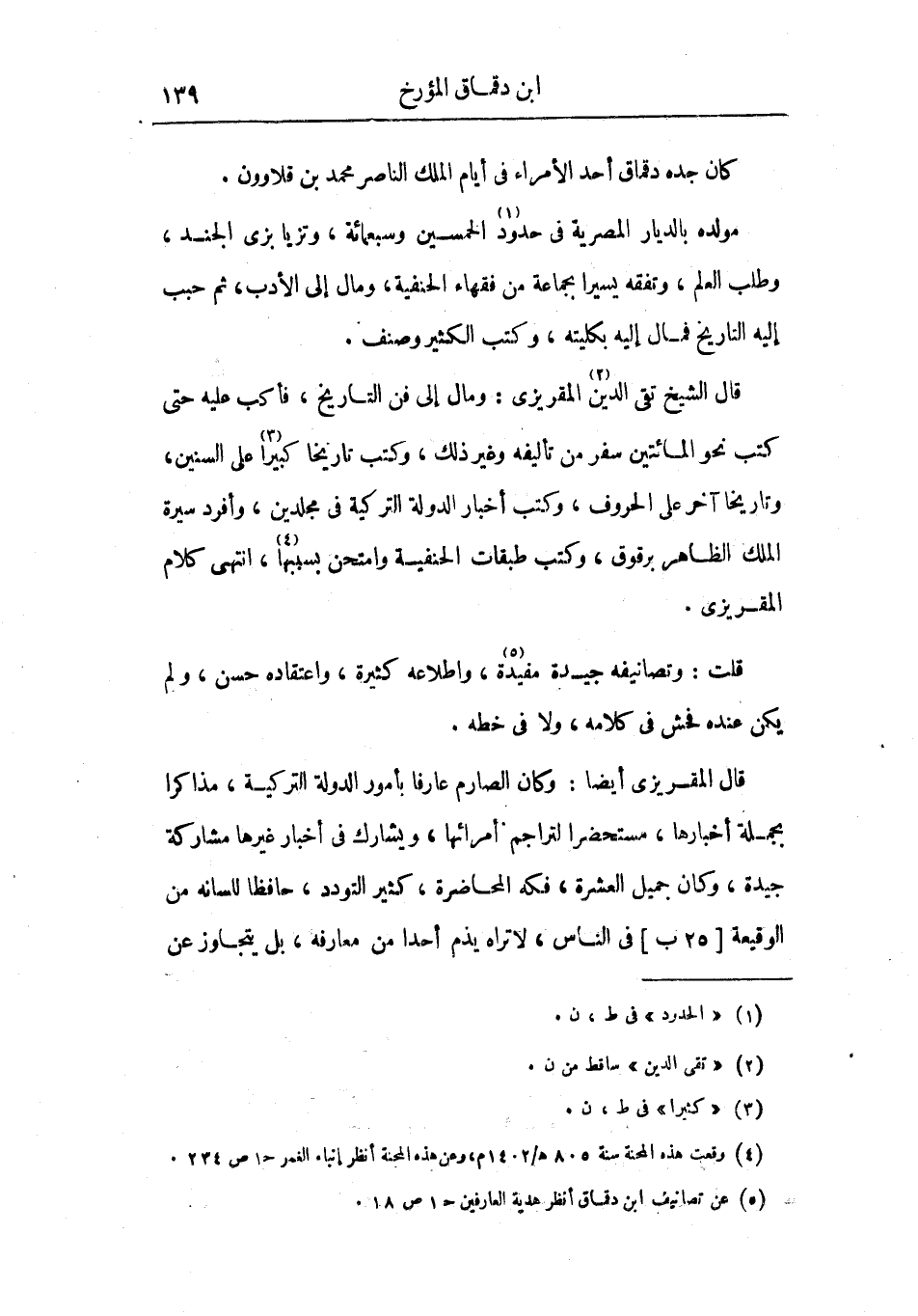 قال الشيخ تقي الدين المقريزي: ومال إلى فن التاريخ، فأكب عليه حتى كتب نحو المائتين سفر من تأليفه وغير ذلك، وكتب تاريخا كبيراً على السنين، وتاريخ آخر على الحروف، وكتب أخبار الدولة التركية في مجلدين، وأفرد سيرة الملك الظاهر برقوق، وكتب طبقات الحنفية وامتحن بسببها، انتهى كلام المقريزي.