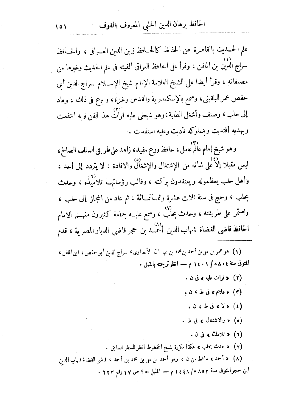 وهو شيخ إمام عالم عامل، حافظ ورع مفيدة، زاهد على طريق السلف الصالح، ليس مقبلا إلا على شأنه من الإشتغال والإشغال والافادة، لا يتردد إلى أحد، وأهل حلب يعظمونه ويعتقدون بركته، وغالب رؤسائها تلاميذه، وحدث بحلب، وحج في سنة ثلاث عشرة وثمانمائة، ثم عاد من الحجاز إلى حلب، واستمر على طريقته، وحدث بحلب، وسمع عليه جماعة كثيرون منهم الإمام الحافظ قاضي القضاة شهاب الدين أحمد بن حجر قاضي الديار المصرية، قدم