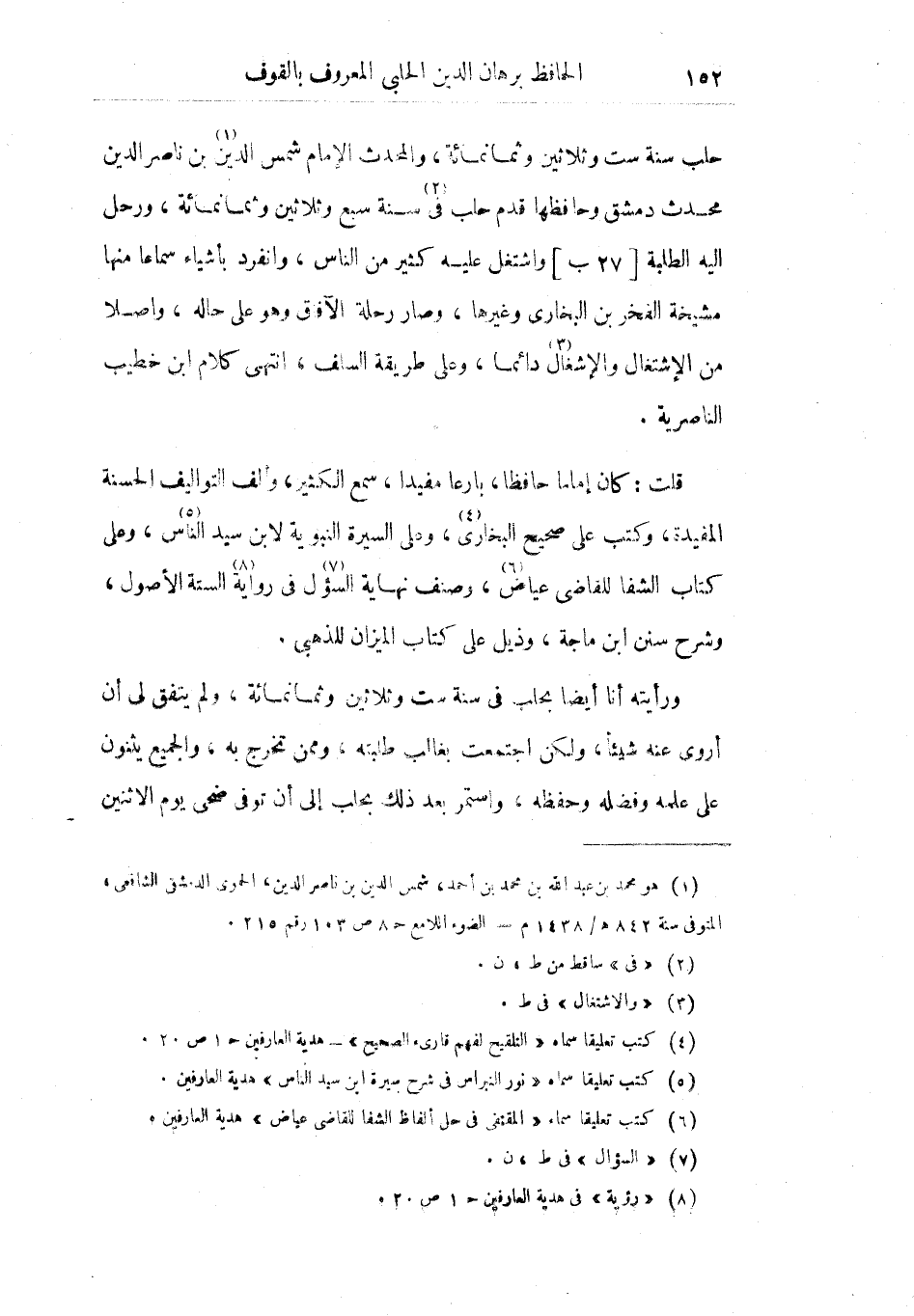 ورأيته أنا أيضا بحلب في سنة ست وثلاثين وثمانمائة، ولم يتفق لي أن أروي عنه شيئا، ولكن اجتمعت بغالب طلبته، وممن تخرج به، والجميع يثنون على علمه وفضله وحفظه، واستمر بعد ذلك بحلب إلى أن توفي ضحى يوم الاثنين