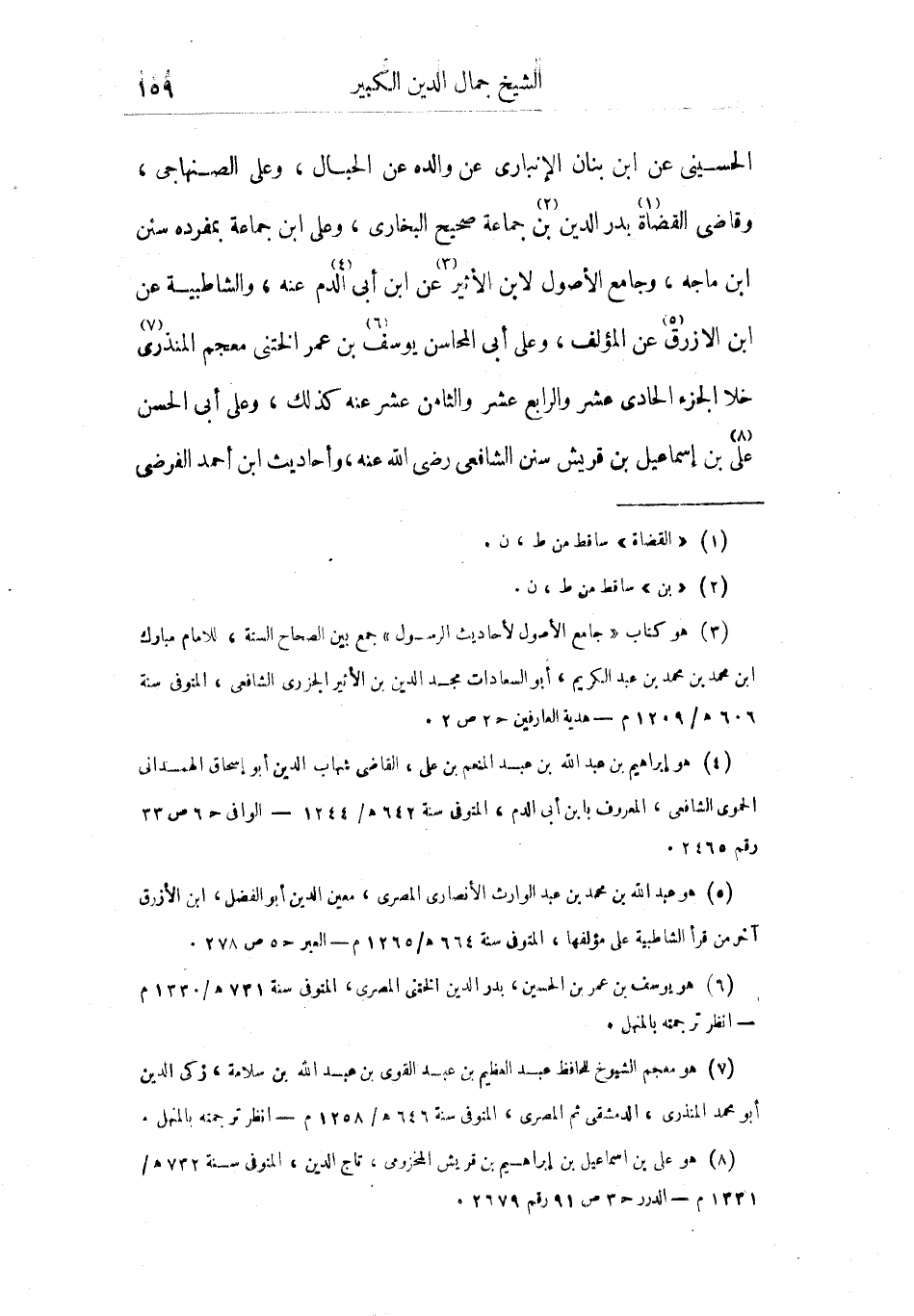 الحسيني عن ابن بنان الإنباري عن والده عن الحبال، وعلى الصنهاجي، وقاضي القضاة بدر الدين بن جماعة صحيح البخاري، وعلى ابن جماعة بمفرده سنن ابن ماجة، وجامع الأصول لابن الأثير عن ابن أبي الدم عنه، والشاطبية عن ابن الازرق عن المؤلف، وعلى أبي المحاسن يوسف بن عمر الختني معجم المنذري خلا الجزء الحادي عشر والرابع عشر والثامن عشر عنه كذلك، وعلى أبي الحسن علي بن إسماعيل بن قريش سنن الشافعي رضي الله عنه، وأحاديث ابن أحمد الفرضي