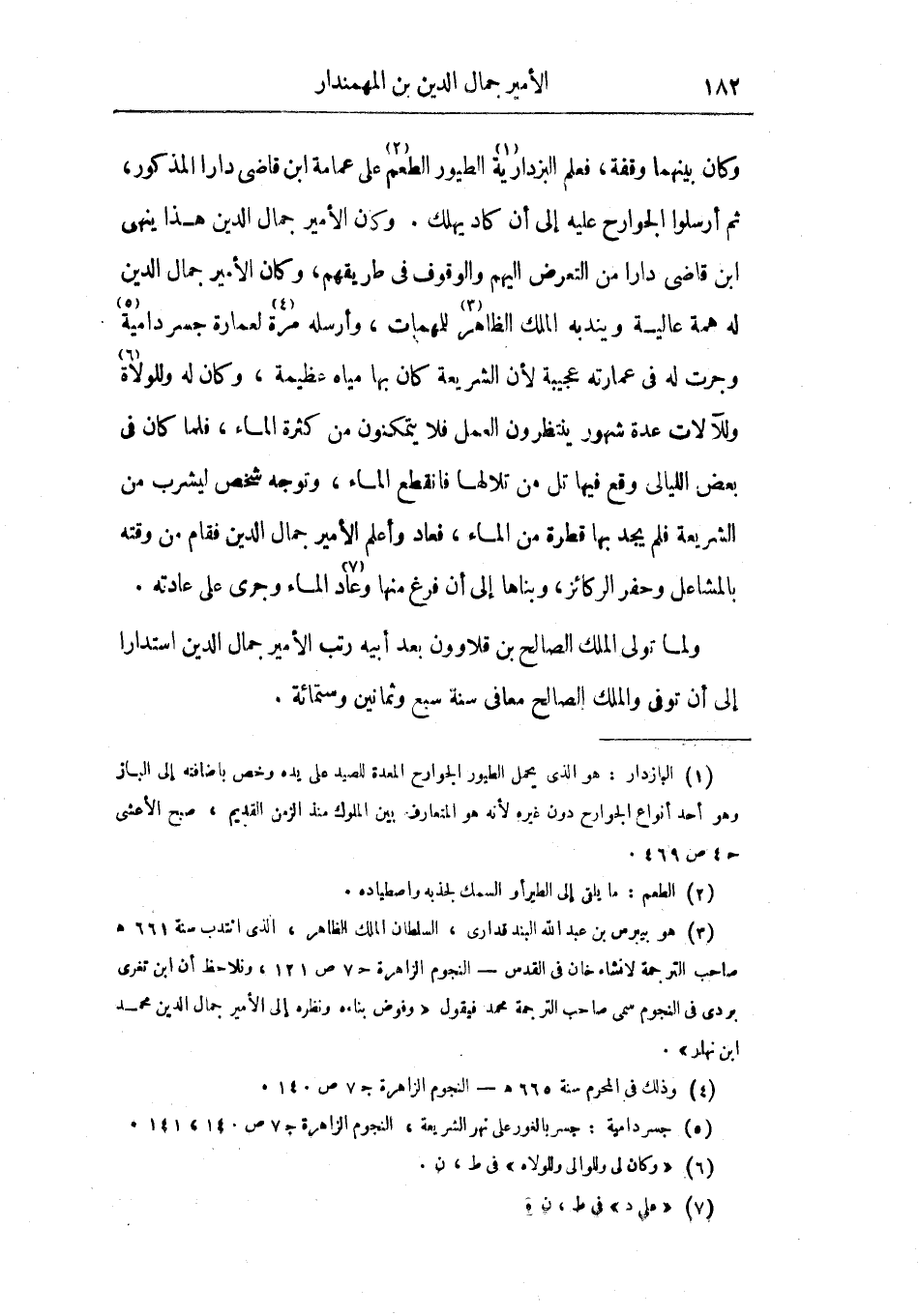 وكان الأمير جمال الدين هذا ينهى ابن قاضي دارا من التعرض إليهم والوقوف في طريقهم، وكان الأمير جمال الدين له همة عالية ويندبه الملك الظاهر للمهمات، وأرسله مرة لعمارة جسر دامية وجرت له في عمارته عجيبة لأن الشريعة كان بها مياه عظيمة، وكان له وللولاة وللآلات عدة شهور ينتظرون العمل فلا يتمكنون من كثرة الماء فلما كان في بعض الليالي وقع فيها تل من تلالها فانقطع الماء، وتوجه شخص ليشرب من الشريعة فلم يجد بها قطرة من الماء، فعاد وأعلم الأمير جمال الدين فقام من وقته بالمشاعل وحفر الركائز، وبناها إلى أن فرغ منها وعاد الماء وجرى على عادته.