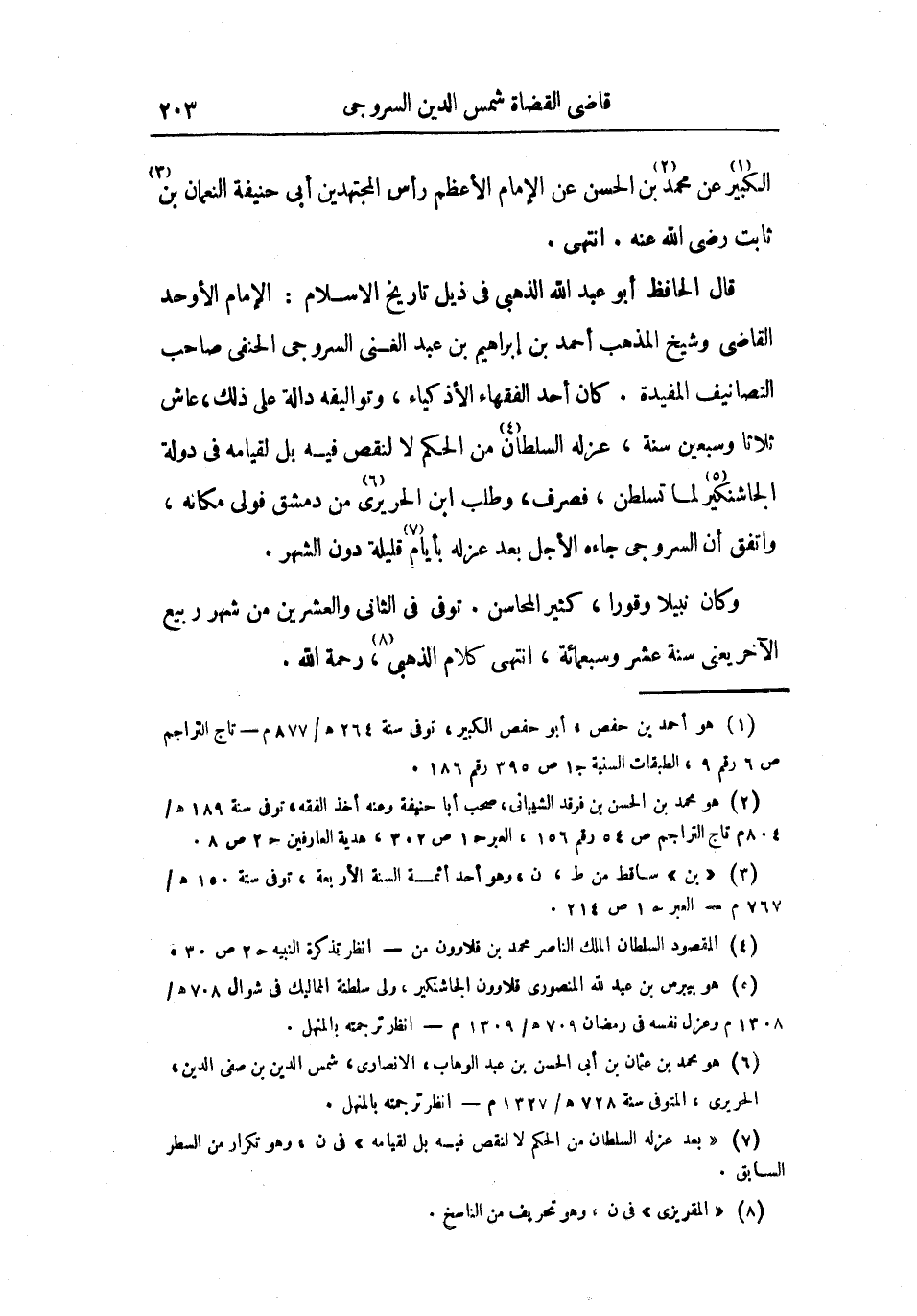 كان أحد الفقهاء الأذكياء، وتواليفه دالة على ذلك، عاش ثلاثا وسبعين سنة، عزله السلطان من الحكم لا لنقص فيه بل لقيامه في دولة الجاشنكير لما تسلطن، فصرف، وطلب ابن الحريري من دمشق فولي مكانه، واتفق أن السروجي جاءه الأجل بعد عزله بأيام قليلة دون الشهر.
