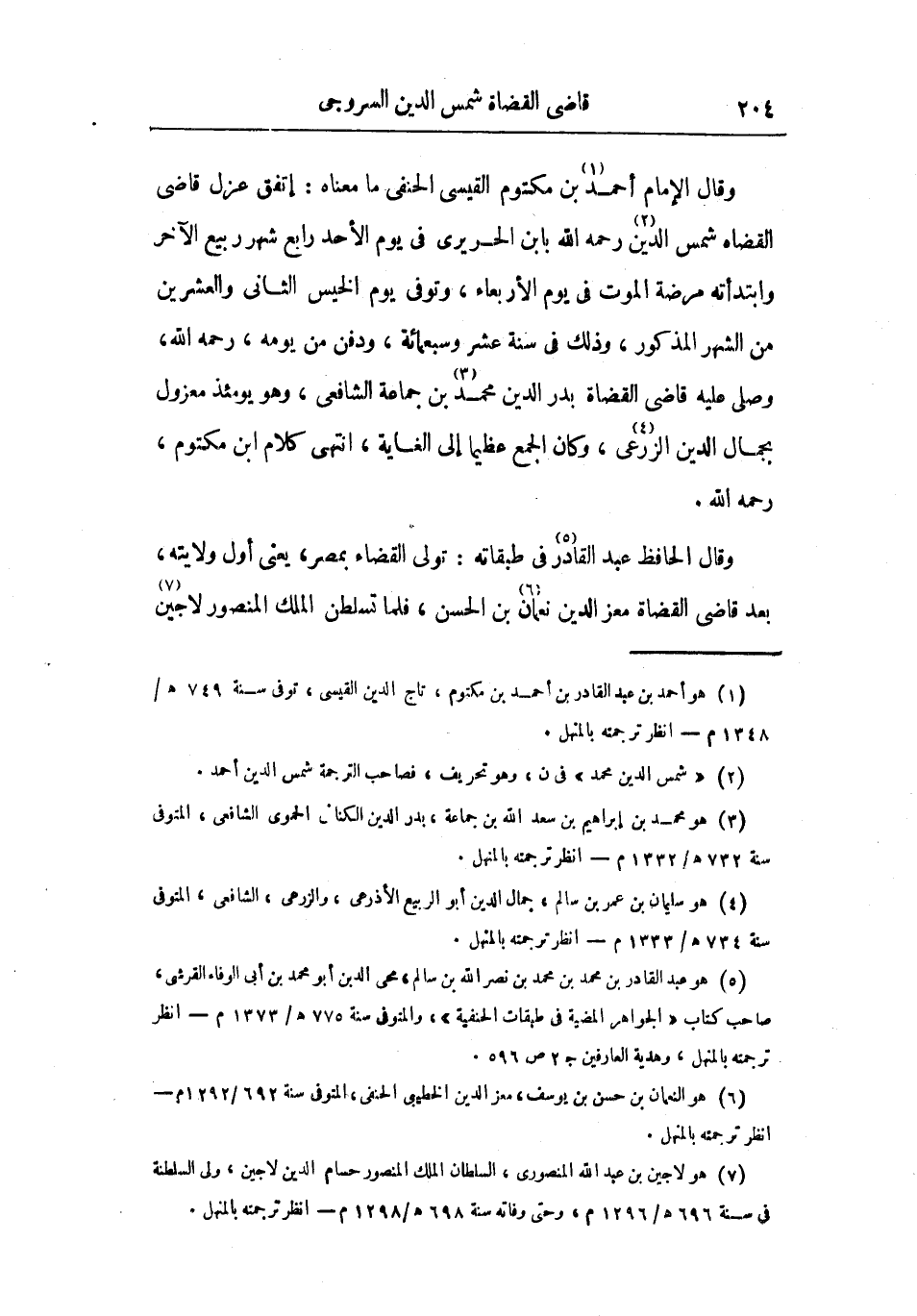 وقال الإمام أحمد بن مكتوم القيسي الحنفي ما معناه: اتفق عزل قاضي القضاة شمس الدين رحمه الله بابن الحريري في يوم الأحد رابع شهر ربيع الآخرة وابتدأته مرضة الموت في يوم الأربعاء، وتوفى يوم الخميس الثاني والعشرين من الشهر المذكور وذلك في سنة عشر وسبعمائة، ودفن من يومه، رحمه الله، وصلى عليه قاضي القضاة بدر الدين محمد بن جماعة الشافعي، وهو يومئذ معزول بجمال الدين الزرعي، وكان الجمع عظيما إلى الغاية، انتهى كلام ابن مكتوم، رحمه الله.