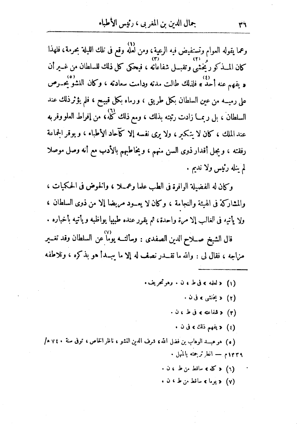 وعما يقوله العوام وتستفيض فيه الرعية، ومن لعله وقع في تلك الليلة بحرمة، فلهذا كان المذكور يخشى وتقبل شفاعته، فيحكى كل ذلك للسلطان من غير أن يفهم عنه أحد فلذلك طالت مدته ودامت سعادته، وكان النشو يحرص على رميه من عين السلطان بكل طريق، ورماه بكل قبيح، فلم يؤثر ذلك عند السلطان، بل ربما زادت رتبته بذلك، ومع ذلك كله، من إفراط العلو وقربه عند الملك، كان لا يتكبر، ولا يرى نفسه إلا كأحد الأطباء، ويوقر الجماعة رفقته، ويجل أقدار ذوي السن منهم، ويخاطبهم بالأدب مع أنه وصل موصلا لم ينله رئيس ولا نديم.