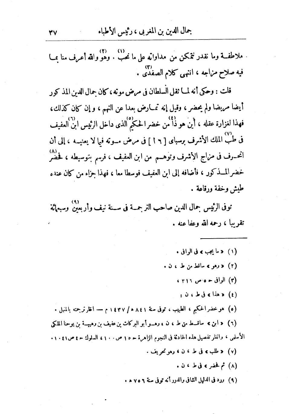 قلت: وحكى أنه لما ثقل السلطان في مرض موته، كان جمال الدين المذكور أيضا مريضا ولم يحضر، وقيل إنه تمارض بعدا عن التهم، وإن كان كذلك، فهذا لغزارة عقله، أين هو ذا من خضر الحكيم الّذي داخل الرئيس ابن العفيف فرسم بتوسيطه فحضر خضر المذكور فأضافه إلى ابن العفيف فوسطا معاً في طب الملك الأشرف برسباي في مرض موته فيما لا يعنيه، إلى أن انحرف في مزاج الأشرف وتوهم من ابن العفيف، فهذا جزاء من كان عنده طيش وخفة ورقاعة.