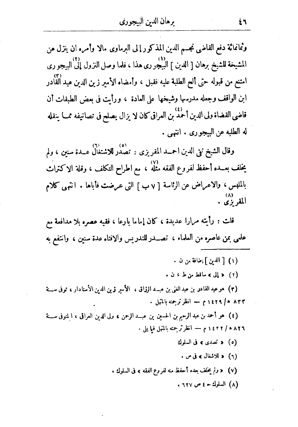 وثمانمائة دفع القاضي نجم الدين المذكور إلى البرماوي مالا وأمره أن ينزل عن المشيخة للشيخ برهان الدين البيجوري هذا، فلما وصل النزول إلى البيجوري امتنع من قبوله حتى ألح الطلبة عليه فقبل، وأمضاه الأمير زين الدين عبد القادر ابن الواقف وجعله مدرسها وشيخها على العادة، ورأيت في بعض الطبقات أن قاضي القضاة ولي الدين أحمد بن العراقي كان لا يزال يصلح في تصانيفه مما ينقله له الطلبة عن البيجوري. انتهى.