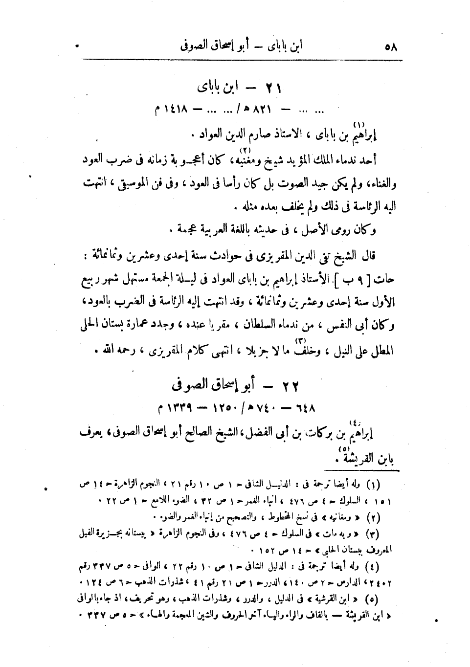 الأستاذ إبراهيم بن باباي العواد في ليلة الجمعة مستهل شهر ربيع الأول سنة إحدى وعشرين وثمانمائة، وقد انتهت إليه الرئاسة في الضرب بالعود، وكان أبي النفس، من ندماء السلطان، مقريا عنده، وجدد عمارة بستان الحلي المطل على النيل، وخلف مالا جزيلا، انتهى كلام القريزي، رحمه الله.