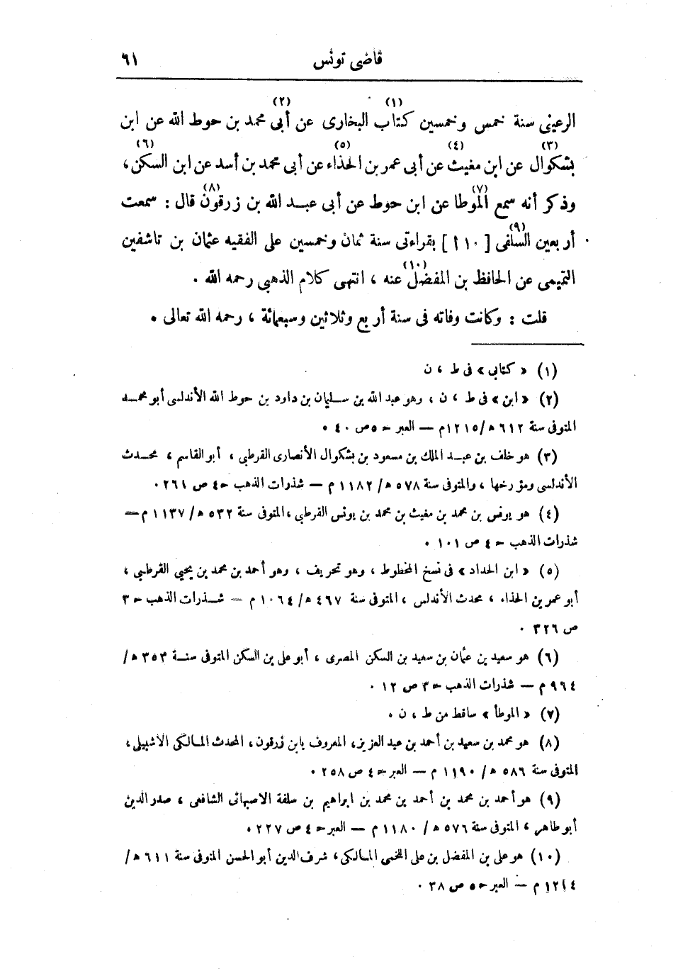 الرعيني سنة خمسة وخمسين كتاب البخاري عن أبي محمد بن حوط الله عن أبن بشكوال عن أبن مغيث عن أبي عمر بن الحذاء عن أبي محمد بن أسد بن أبن السكن، وذكر أنه سمع الموطأ عن أبن حوط عن أبي عبد الله بن زرقون قال: سمعت أربعين السلفي بقراءتي سنة ثمان وخمسين على الفقيه عثمان بن تاشفين التميمي عن الحافظ بن المفضل عنه، انتهى كلام الذهبي رحمه الله.