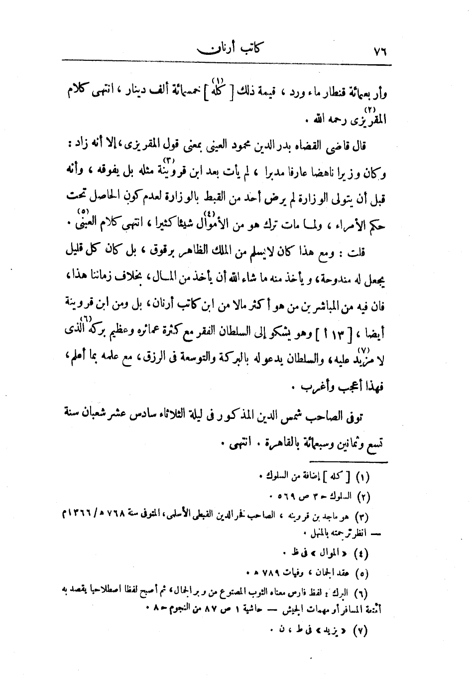 قلت: ومع هذا كان لا يسلم من الملك الظاهر برقوق، بل كان كل قليل يجعل له مندوحة، ويأخذ منه ما شاء الله أن يأخذ من المال، بخلاف زماننا هذا، فإن فيه من المباشرين من هو أكثر مالا من أبن كاتب أرنان، بل ومن أبن قروينة أيضا، وهو يشكو إلى السلطان الفقر مع كثرة عمائره وعظيم بركة الذي لا مزيد عليه، والسلطان يدعو له بالبركة والتوسعة في الرزق، مع علمه بما أعلم، فهذا أعجب وأغرب.